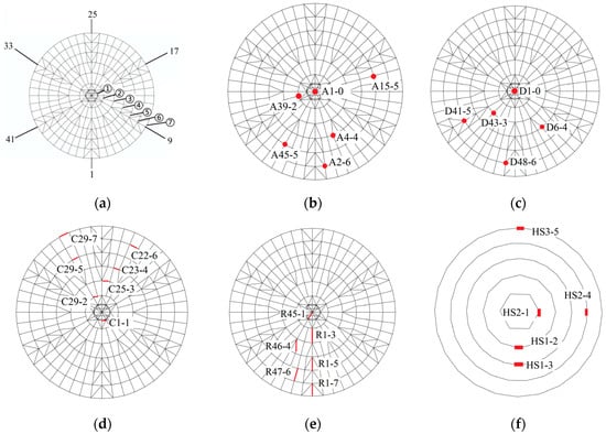 Measuring points: (a) radial numbers and ring numbers; (b) acceleration; (c) displacement; (d) ring bar; (e) radial bar; (f) hoop cable.