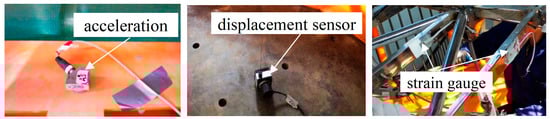 Figure 6 presents the test instruments used in the experiment. The range of the acceleration sensors is from −16 g to 16 g, while the range of the pull-wire displacement sensors spans from 250 mm to 1000 mm. The resistance value and sensitivity coefficient of the strain gauges are 120.3 ± 0.1 Ω and 2.22 ± 1%, respectively.