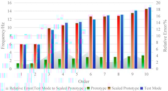 To validate the proposed substructure simplification method and the accuracy of the test model, a white noise excitation test was conducted on the model (Figure 4c). The natural frequencies were then identified through spectral analysis of the acquired acceleration data. Due to the complex geometry and numerous components of the prototype structure’s substructure, Midas/Gen 2024 software was adopted to establish the finite element model of the prototype structure and carry out modal analysis on the model. Figure 7 compares the first ten natural frequencies of the test model with their counterparts from the scaled prototype structure (after applying the scale ratio). It can be seen that the natural frequencies of the test model, after scaling, show close agreement with those of the prototype structure; the relative errors for all modal orders are within 6%. Notably, the error for the fundamental frequency is only 1.30%. It is demonstrated that the method of accounting for the concrete substructure of the suspen-dome prototype structure in the test scale model is accurate.