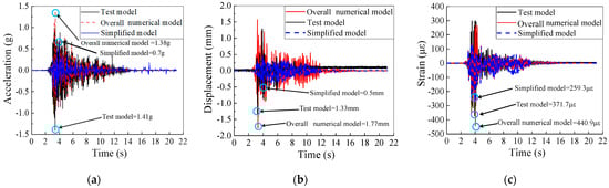 Comparison of seismic responses: (a) acceleration–time-history curve of measuring point A1-0; (b) displacement–time-history curve of measuring point D41-5; (c) strain–time-history curve of measuring point C29-5.