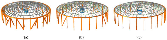 To further investigate the dynamic characteristics and seismic response of suspen-dome structures with substructures, three overall numerical models with varying substructure stiffness levels were established by ABAQUS software. Model 1 was taken as the model with a strong stiffness substructure. Meanwhile, Model 2 with a medium stiffness substructure and Model 3 with a weak stiffness substructure were established by reducing the diagonal braces in Model 1, as shown in Figure 12. The substructure lateral stiffness of the three models is 159.1 kN/mm, 69.9 kN/mm and 23.7 kN/mm, respectively.