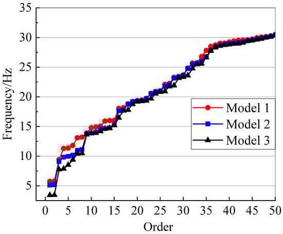 Modal analysis was performed on the three overall models, and their first 50-order natural frequencies are compared in Figure 13. It can be observed that with the reduction in the substructure stiffness, the natural frequencies of the suspen-dome structure decrease significantly; the fundamental frequencies of Model 1, Model 2, and Model 3 are 5.75 Hz, 5.11 Hz, and 3.42 Hz, respectively. That is to say, the reduction in the substructure stiffness will reduce the stiffness of the overall suspen-dome structure, thereby reducing the natural frequency of the structure.
