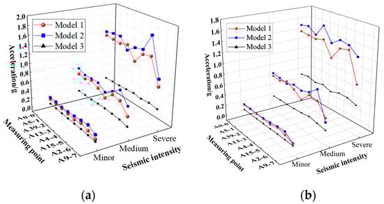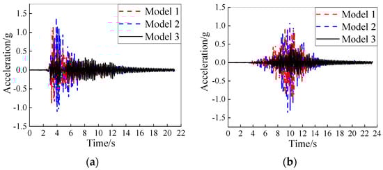 The seismic time-history analysis was carried out on Model 1, Model 2, and Model 3, respectively, and one measuring point was selected from each ring of the superstructure. The acceleration data of the seismic record collected from the shaking table was used as the severe seismic load. Meanwhile, in order to consider the influence of seismic intensity on structural seismic response, according to relevant regulations, the peak acceleration values collected from the vibration table were reduced by 2 times and 5.7 times, respectively, and used as medium and minor seismic loads.