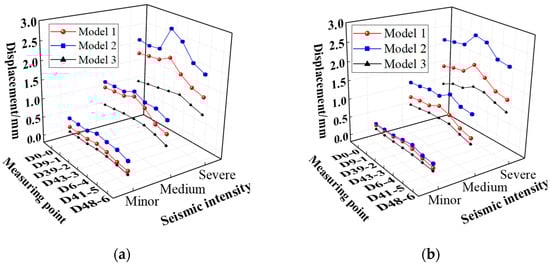 Table 8 presents the maximum peak displacement of the three models under seismic actions of varying intensities. It can be seen that there are significant differences in the maximum displacement responses among the three models, with Model 2 exhibiting the largest displacement response, followed by Model 1, and Model 3 having the weakest displacement response. That is to say, the deformation of Model 2 is the most obvious, followed by Model 1, and the deformation of Model 3 is the smallest.