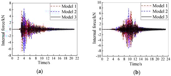 Internal force–time-history curve of measuring point C29-7: (a) TAFT record; (b) Beijing record.