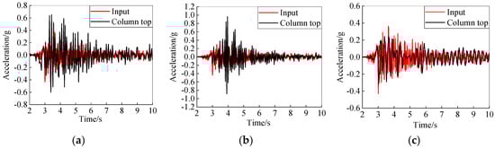 Acceleration–time-history curve comparison of column top and input seismic record: (a) Model 1; (b) Model 2; (c) Model 3.