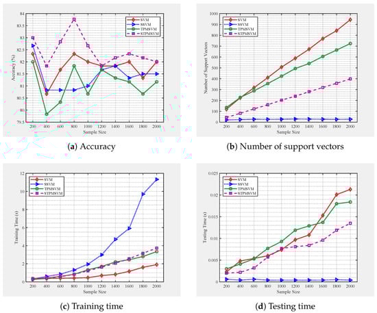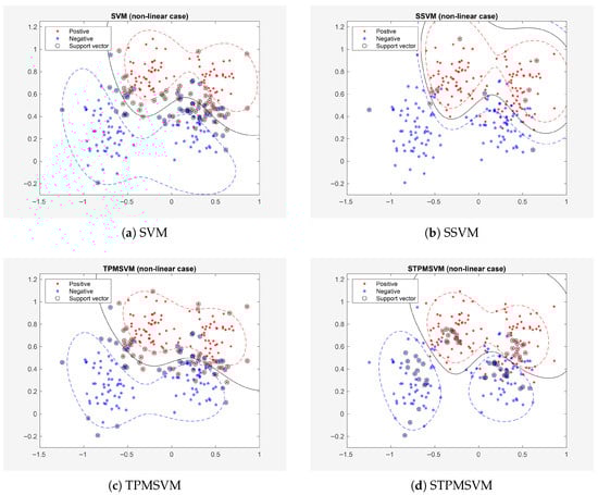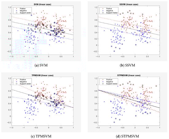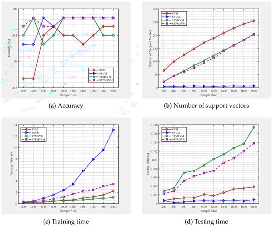 Beyond the above quantitative metrics, the experimental outcomes in this paper provide profound insights into the underlying mechanism. The collective results consistently demonstrate that the proposed SSVM and STPMSVM models achieve a significant reduction in the number of SVs compared to their standard counterparts. This pervasive phenomenon provides strong empirical validation that the initial geometric motivation of employing an -norm penalty—to break rotational symmetry—has been successfully translated, via the KKT conditions, into the final models’ operational principle. The resulting sparsity of the solutions stands as direct empirical evidence for the successful implementation of the initial symmetry-breaking design.