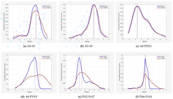 As a complementary analysis, we examined the margin distributions for six representative datasets across the above different noise types. The mean and standard deviation of the margins, as well as the margin values corresponding to the peaks, are reported in Table 10. To visualize the results, Figure 6 shows the probability density of margins for SVM and SSVM across the six representative datasets, and Figure 7 presents the corresponding densities for TPMSVM and STPMSVM. The two groups are presented separately because SVM-based models and TPMSVM-based models cannot be directly compared on the same dataset. The x-axis represents the margin values for each sample, and the y-axis represents the estimated probability density obtained via kernel density estimation.