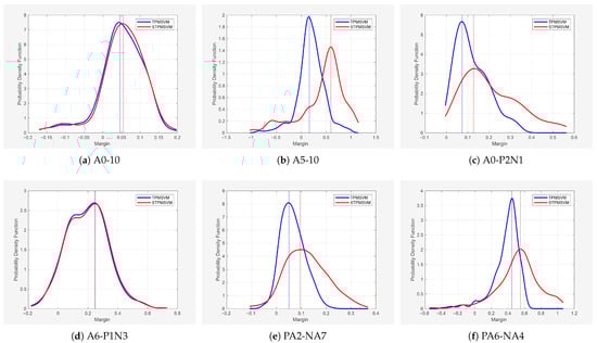 Distribution of classification margins for TPMSVM vs. STPMSVM across six representative datasets.