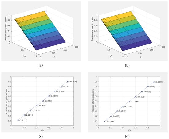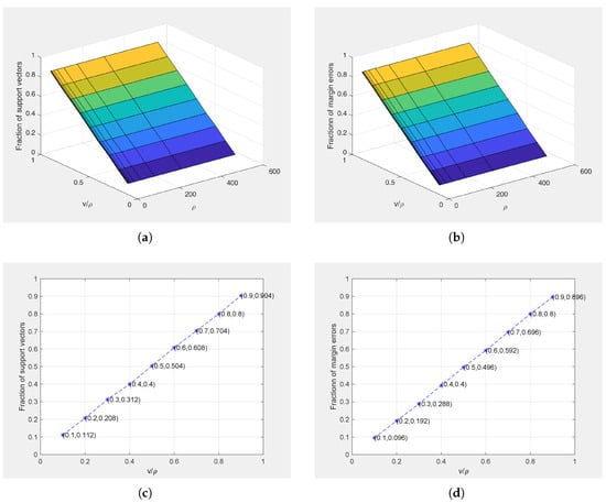Relations between () and the fractions of support vectors and margin errors on Ripley’s dataset for the non-linear case (). (a) 3D graph of the relationship between () and the fraction of support vectors; (b) 3D graph of the relationship between () and the fraction of margin errors; (c) Relationship between and the fraction of support vectors (); (d) Relationship between and the fraction of margin errors ().