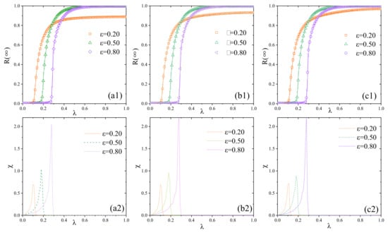 Figure 2 explores the relationship between the final propagation range and the propagation probability on the ER network with different regret thresholds. The proportion parameters of the regret population are , 0.5, and 0.8 in Figure 2(a1), Figure 2(b1), and Figure 2(c1), respectively. From Figure 2(a1–c1), we can see that as the propagation probability increases, the propagation range shows a first increase and subsequently tends to stabilize. Furthermore, as the regret threshold rises, the propagation range increases to global adoption. The propagation curves present a continuous second-order phase transition when and a discontinuous first-order phase transition when increases to 0.8. Figure 2(a2)–(c2) shows that the phase transition phenomenon will occur and reach global behavioral adoption when the propagation probability reaches the critical value. Figure 2(a2)–(c2) shows that the phase transition phenomenon will occur and reach global behavioral adoption when the propagation probability reaches the critical value. In addition, the proportion of the regret population has a little influence on information propagation in this network topology and parameters. Figure 2 shows that the theoretical prediction agrees well with the simulation.