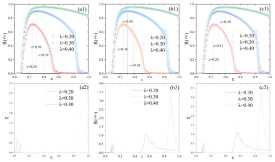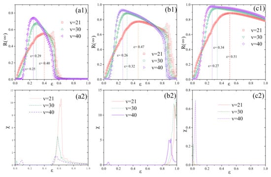 Figure 5 depicts the relationship between and on the SF network with degree distribution heterogeneity. As the propagation probability increases, gradually increases and reaches global adoption. In Figure 5a, a decrease in degree heterogeneity (with a large value of v) will facilitate the information propagation with a slight regret threshold. The degree of heterogeneity effect on information propagation weakens while the regret threshold becomes large. Comparing the subgraphs in Figure 5(a1)–(c1), the increase in the regret threshold prevents the information propagation and facilitates the change in the phase transition pattern from the second-order continuity to the first-order discontinuity. Figure 5(a2)–(c2) correspond to the critical propagation probabilities of Figure 5(a1)–(c1). The simulated values (symbols) fit well with the theoretical values (lines).