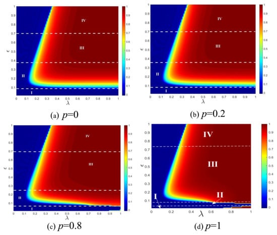 Figure 4 investigates the joint effect of the transmission probability and the regret threshold ratio on the final spread range in the ER network. In Figure 4a–d, the regret population ratio parameter p is 0, 0.2, 0.8, and 1, respectively. In Figure 4a–c, the parameter plane can be divided into four regions. In region I, is very small, and the information hardly spreads in the population, with no population adopting the behavior. This occurs because hinders information diffusion throughout the population. In region II, as increases, the information spreads to a limited extent but does not achieve global adoption. In region III, as increases, the information spread gradually enters global, and as increases, the growth pattern exhibits a second-order continuous phase transition. In region IV, as increases, the growth pattern transitions from a second-order continuous phase transition to a first-order discontinuous phase transition. More interestingly, for a given , the final spread range varies non-monotonically with . When is low, initially rises and then falls, analogous to the behavior in Figure 3. In this case, due to the low information transmission probability, regret behavior dominates. As the information transmission probability increases, rises monotonically. In this case, non-regret behavior dominates. In Figure 4d, in addition to the similar phenomena in Figure 4a–c, it can be clearly observed that there is a mutation in region I that is different from the other subplots. When is very small, increases with to the global behavior adoption state. In Figure 4d, all individuals are susceptible to regret. When the unit transmission probability is relatively large, although the adoption probability is small, agents are highly likely to experience regret. The regret characteristic promotes information spread. Therefore, the information can spread and the behavior can be globally adopted throughout the group. As increases, the threshold function exhibits a two-stage pattern—an initial rise followed by a decline, and then a secondary sinusoidal increase. This “rise–fall–rise” curve shape introduces a hesitation zone in the system, during which individuals temporarily lose their willingness to adopt the behavior.