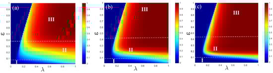 Figure 7 investigates the joint effect of and the regret threshold parameter on the final propagation range in the SF network. Figure 7a–c correspond to , respectively. The regret population proportion parameter is . In Figure 7a–c, the parameter plane can be divided into three regions. There is no global behavioral adoption outbreak in region I. That is because at a low value of , an individual has little interest in information and behavioral propagation. The final propagation range shows a second-order continuous phase transition pattern in region II and a first-order discontinuous phase transition in region III. More exciting, the final propagation range varies non-monotonically with for a given . With a low , rises initially and subsequently declines. The reason is similar to Figure 6. In this case, regretful behavior dominates the information propagation process due to the lower information propagation probability. rises monotonically to global behavioral adoption as information propagation probability increases. In this case, the non-regret behavior dominates the information propagation process. Comparing Figure 7a–c, when v and are small, such as in Figure 7a, the increase in behavioral adoption population is slow, continuous, and long as the propagation probability increases.