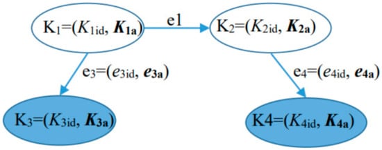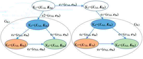 In a teaching knowledge graph GK = (V, E, AV, AE, A, E), consider two entities K1 = (K1id, K1a) V and K2 = (K2id, K2a) V, where K1aAV and K2aAV. Suppose there exists a connecting relation e1 = (e1id, e1a) E, with e1a AE. If the attribute values of the entities satisfy K1a = K2a, then entities are said to exhibit connection symmetry, denoted as K1K2. As shown in Figure 1.