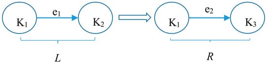 In the context of intelligent teaching scenarios, improvements in teaching methods, content, objectives, and other knowledge elements necessitate updates to the knowledge graph, including the replacement of older teaching entities with improved ones. As shown in Figure 6, suppose there are two entities K1 = (K1id, K1a) and K2 = (K2id, K2a) in the knowledge graph Gk. To replace the older teaching entity K2 with an improved teaching entity K3 = (K3id, K3a), not only must the entity itself be replaced, but the original connection relation e1 = (e1id, e1a) between K1 and K2 must also be replaced with a new connection relation e2 = (e2id, e2a). Here, K2a = K3a and e1a = e2a. Formally, this can be represented as p2: K1 {K2, e1}→K1 {K3, e2}.