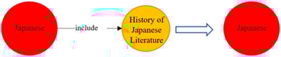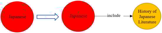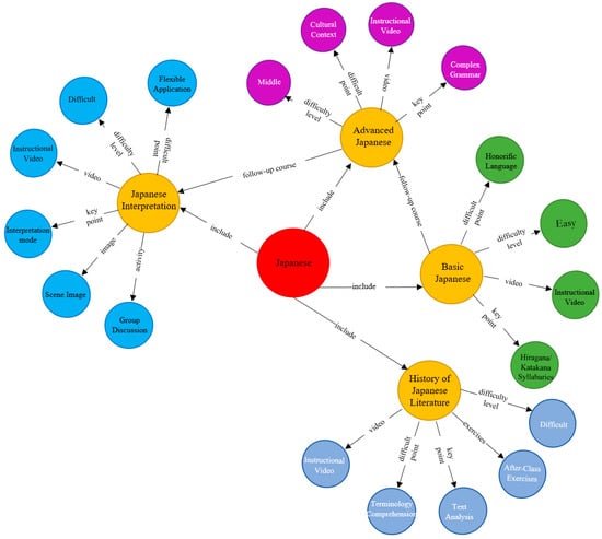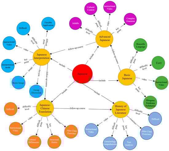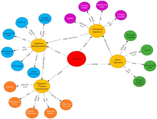 As shown in Figure 10, the teaching knowledge graph for the Japanese Language Major is a directed graph comprising various types of nodes and edges to reflect the teaching relationships within the Japanese language major training system. This graph is a semantic network that organizes Japanese learning content in a structured manner, formally defined as a directed attributed graph GR0 = (V, E, AV, AE, A, E), where V represents the set of knowledge point nodes such as “Japanese”, “Basic Japanese”, “Honorific System”, etc., and E denotes directed relationships between knowledge points like “include”, “follow-up”, “key point”, etc.; AV is the set of node attributes used to label different types of teaching entity attributes such as Type I, Type II, Type III, including major, course, course knowledge, etc., while AE is the set of edge attributes used to label relationship properties between different types of entities, such as relationships between Type I and Type II entities, among Type II entities, and between Type II and Type III entities, including properties like “include”, “sequence”, “type”, etc.; A is a node mapping function that assigns attributes to specific nodes, for example, assigning Type I node attributes to the Japanese Language Major node. E is an edge mapping function that assigns attributes to specific edges, for example, assigning the “include” attribute to the edge between the Japanese Language Major node and the Basic Japanese node.