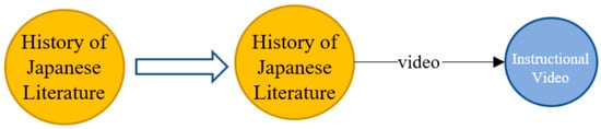 The teaching knowledge graph for the Japanese Language Major is not static but continuously evolves in response to changing demands for talent development updated curriculum systems and shifting language usage environments. For example, to meet the need for cultivating well rounded Japanese language professionals the course “History of Japanese Literature” must be incorporated into the curriculum requiring corresponding evolution of the teaching knowledge graph. This evolution must appropriately reflect various knowledge points related to the new course. Such evolution not only involves the addition of nodes and edges but also highlights that a teaching knowledge graph with adaptive capabilities is essential for enabling precise and personalized intelligent foreign language instruction. To achieve this six instances of the addition evolution rule p1: K1→K1 {K2, e1} are sequentially applied to add six nodes including “History of Japanese Literature” “Instructional Video” “Terminology Comprehension” “Text Analysis” “Exercises” and “Difficult” as well as eight edges labeled “include” “video” “ difficult point” “key point” “exercises” and “difficulty level”. Figure 11 and Figure 12 illustrate the evolution rules for adding the entities “History of Japanese Literature” and “Instructional Video”, respectively. Due to space limitations the remaining similar evolution rules are not repeated here. Additionally one instance of the replacement evolution rule p2: K1 {K2, e1}→K1 {K3, e2} is applied replacing the previously empty edge between the nodes “Japanese Chinese Translation” and “History of Japanese Literature” with a “follow up course” edge. As shown in Figure 13, GR1 is the resulting graph after applying the aforementioned evolution rules to the initial graph GR0.