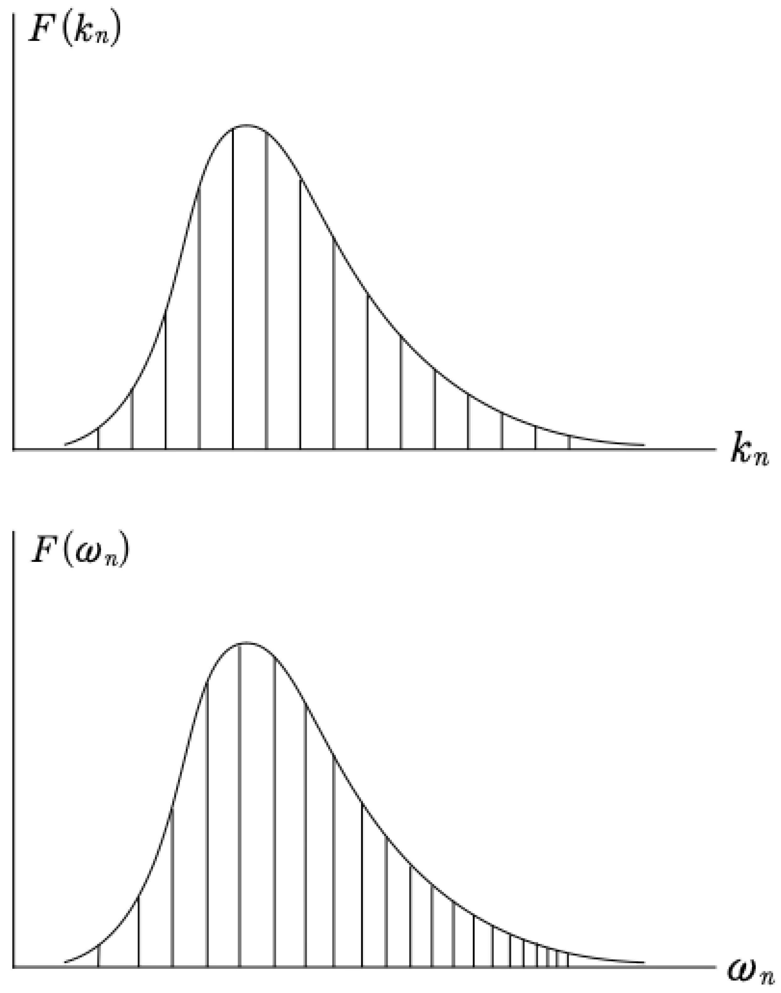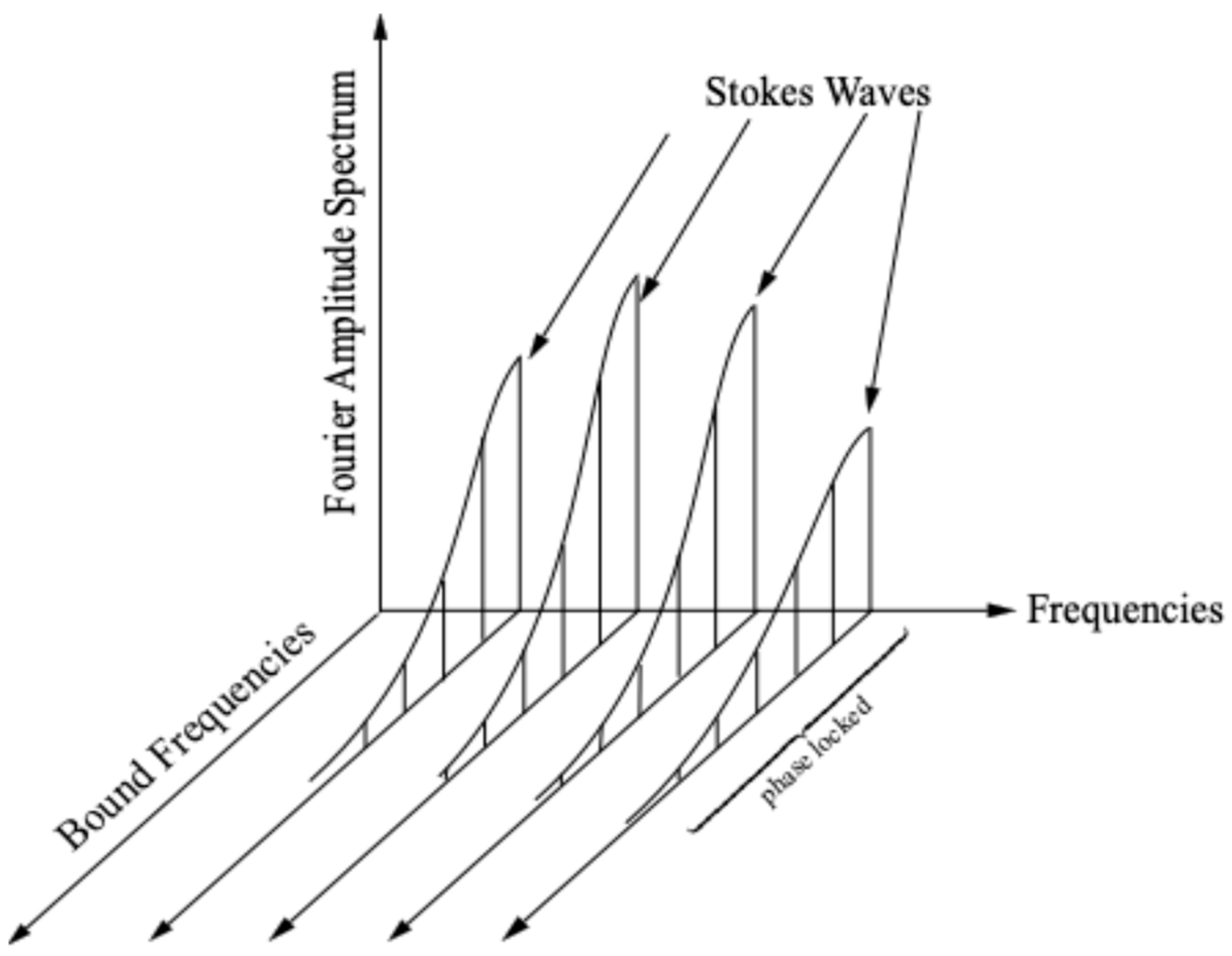 The Hamiltonian is a constant for evolution described by the KdV equation. Time is not explicit in the Hamiltonian but is implicit in the qs and ps ((63) and (64)). We can see that the three-wave interactions are derived from the nonlinear term (proportional to ) in the KdV equation. The time evolution of the spatially periodic Fourier modes, , is given by quasiperiodic Fourier series (19). We now look at some properties of these latter modes.