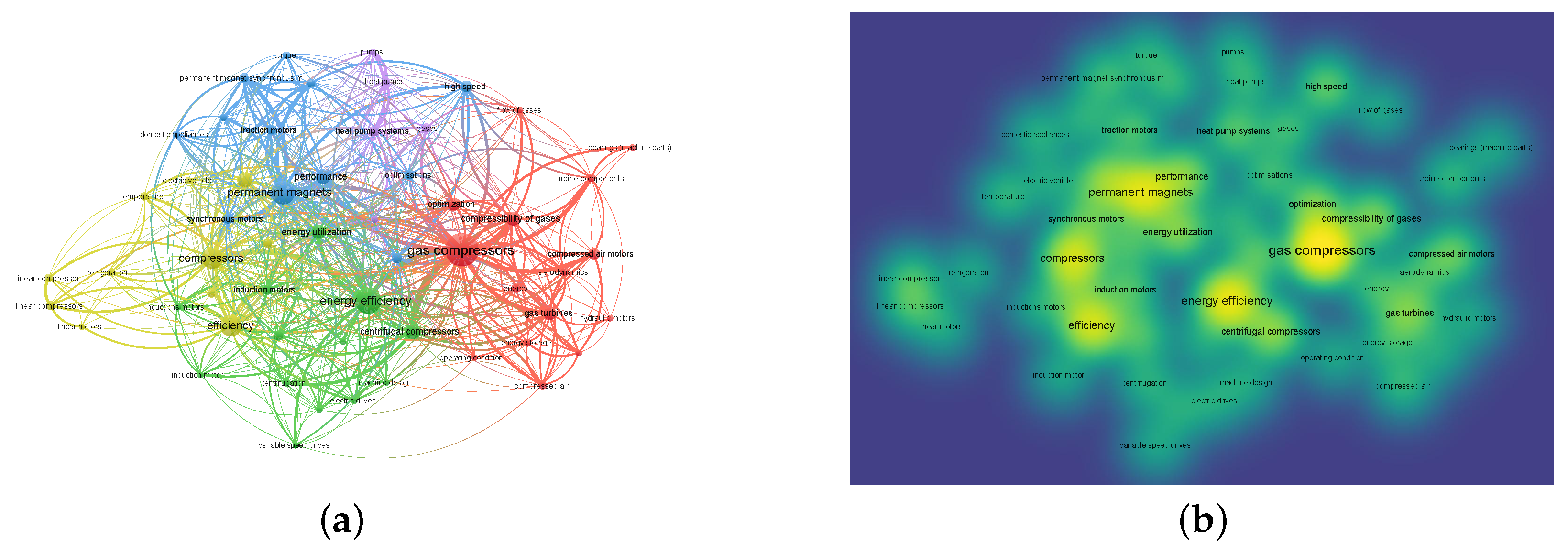 Figure 1a), clusters of terms reflect the main research lines. Among them, compressed air, energy efficiency, optimization, induction motors, and gas turbines emerge as central nodes with high co-occurrence. The interconnection of these terms highlights the cross-cutting relevance of compressors in various industrial applications, ranging from refrigeration and energy storage to electric traction and pumping systems. The presence of keywords such as machine design, aerodynamics, and performance confirms the growing interest in integrating mechanical design with energy optimization approaches.
