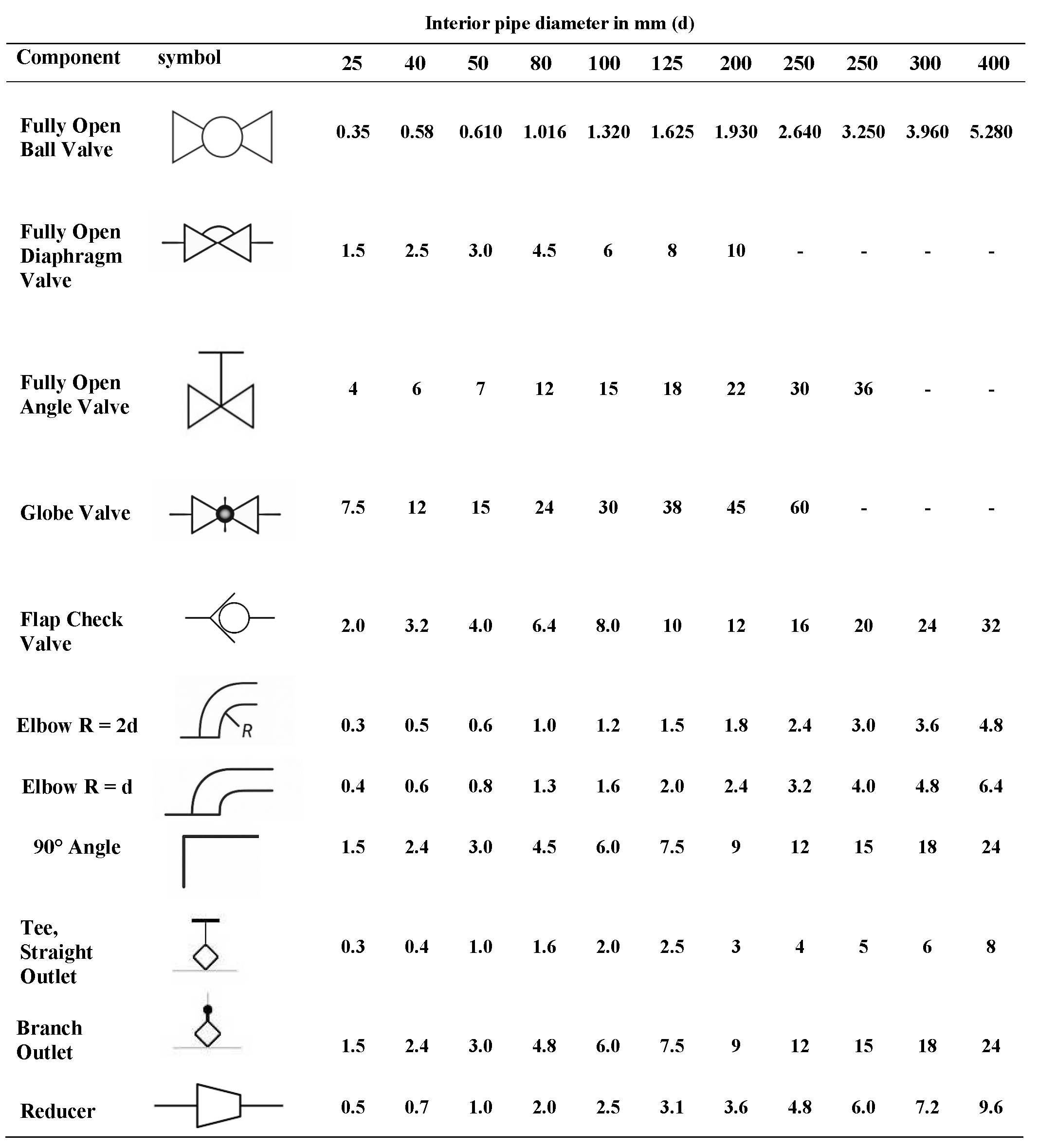 | All diameters | 0.0046 | Vertical pipes |