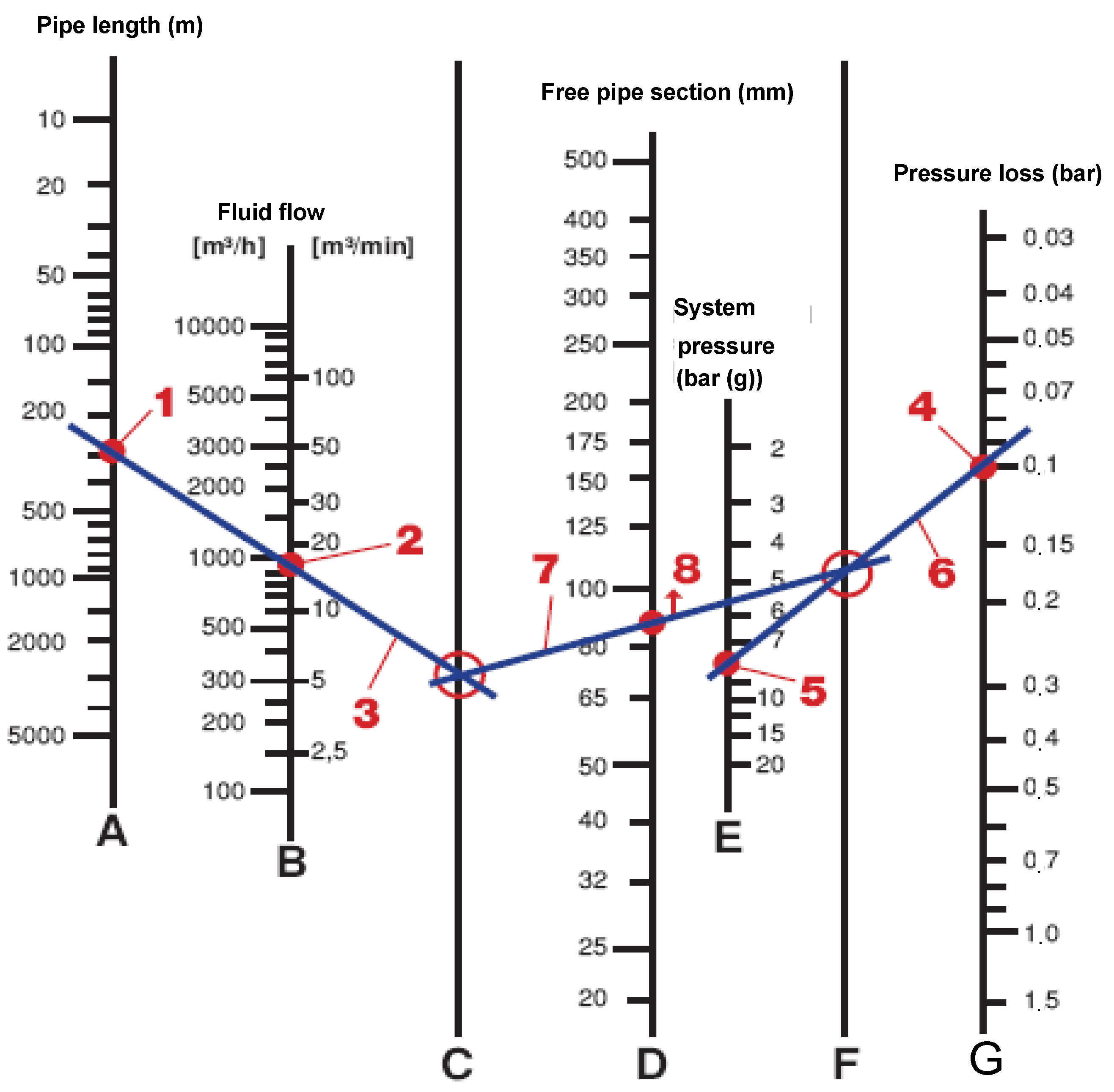 The internal diameter of compressed air pipes can be calculated with the help of a nomogram as follows: first, mark the pipe length and the flow rate on axes A and B. Connect both points with a straight line that intersects axis C. Then, mark the minimum system pressure and the maximum allowable pressure drop on axes E and G. The straight line between these points intersects axis F. Finally, the line connecting the intersections on axes C and F cuts axis D at the point indicating the required pipe diameter.