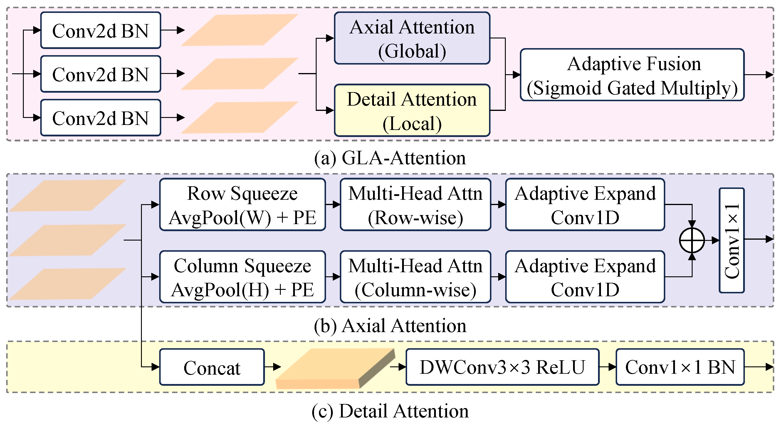 Architecture of GLA-Attention (a), consisting of an axial attention branch (b) and a detail enhancement branch (c). The squeeze operation reduces spatial dimensions, while positional embeddings capture location-aware features.