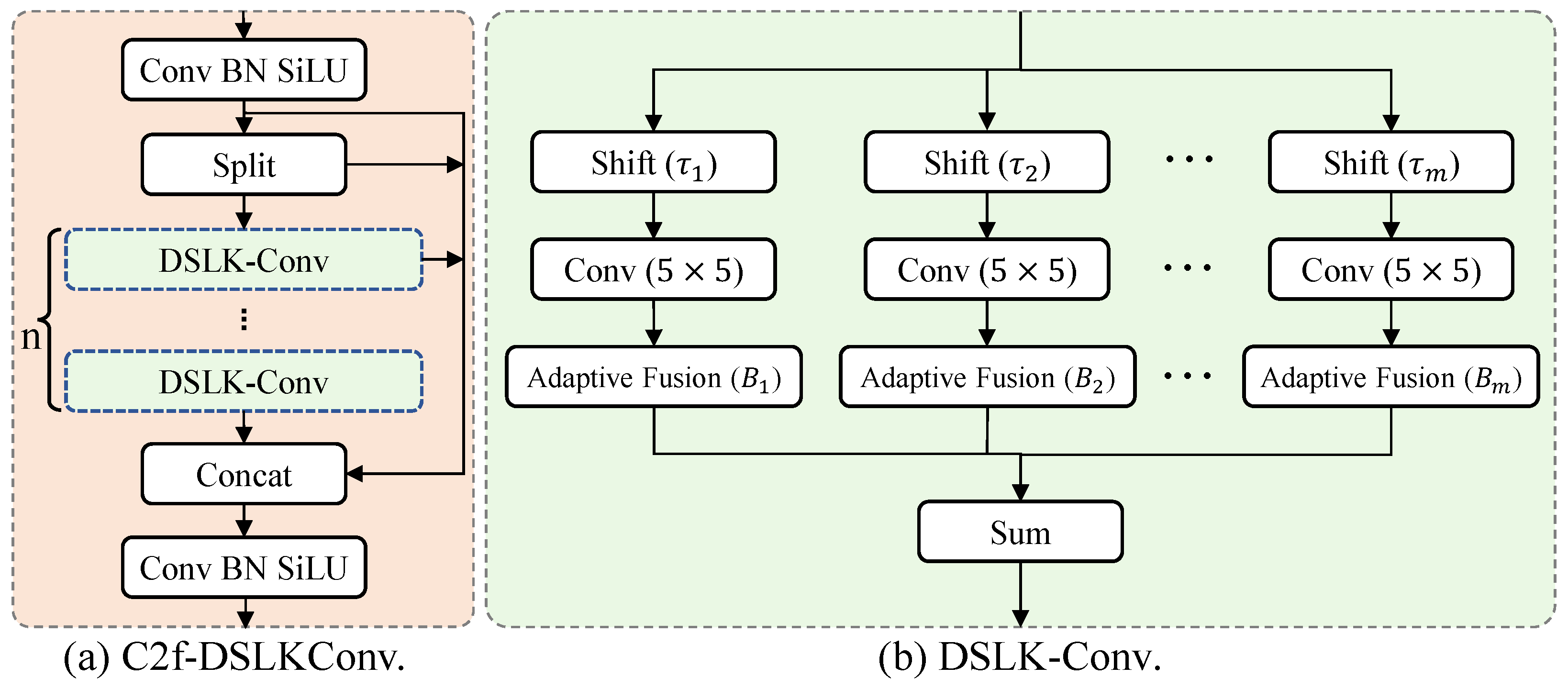 Architecture of the proposed C2f-DSLKConv module. (a) The C2f-DSLKConv block splits the input feature map into two parts, processes one through n stacked DSLK-Conv layers, and concatenates the outputs before applying a final convolution. (b) Each DSLK-Conv layer consists of M parallel branches; each branch applies a spatial shift followed by a convolution, with adaptive fusion via a learnable weighting parameter. The weighted branch outputs are summed to yield the final response, enabling efficient large receptive field modeling and flexible feature integration.