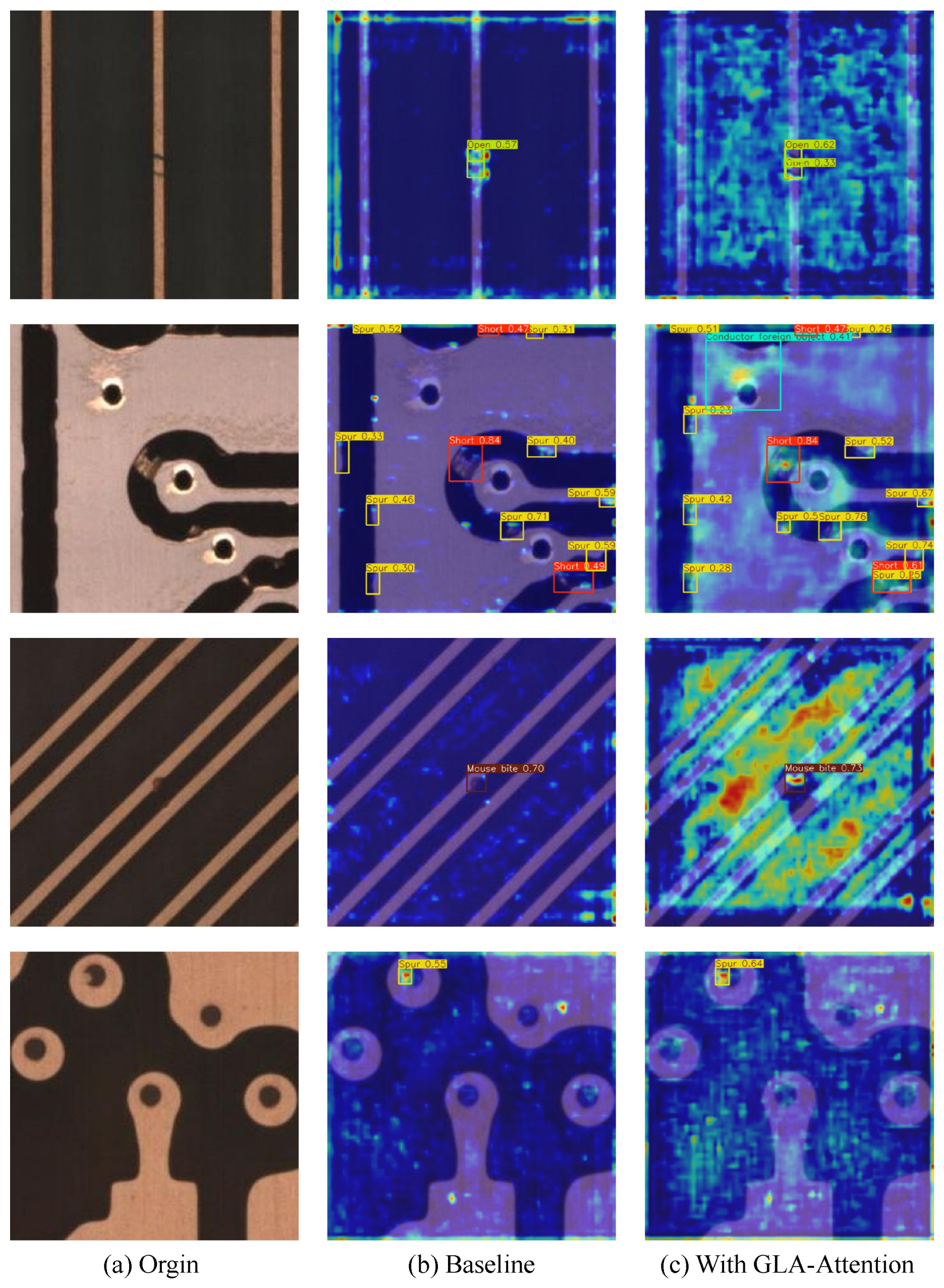 Comparison of attention heatmaps: (a) Original PCB image, (b) Baseline model, (c) Baseline + GLA-Attention. The GLA-Attention module demonstrates more comprehensive global information extraction with broader feature coverage and stronger defect location activation compared to the baseline.