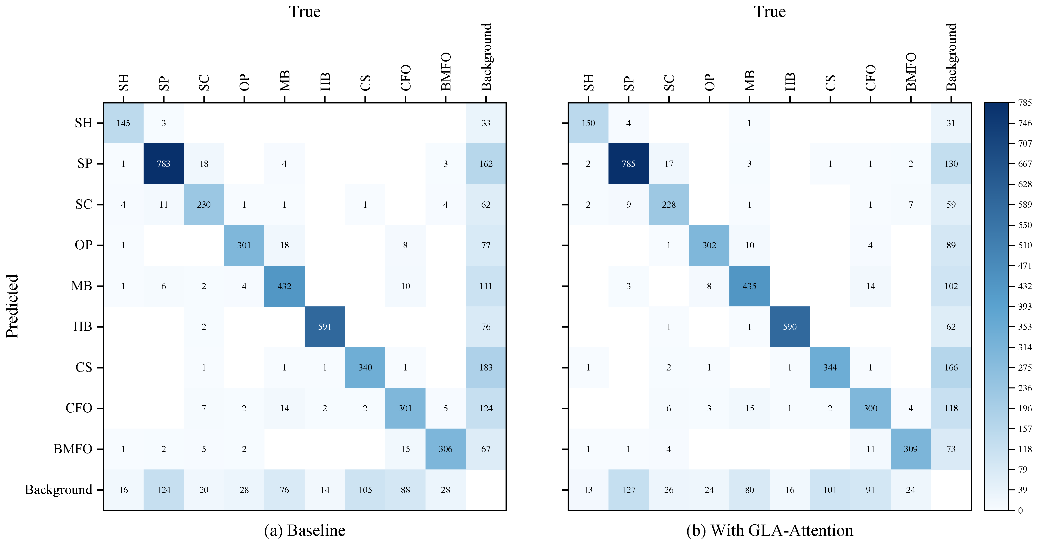 Confusion matrix comparison: (a) Baseline, (b) With GLA-Attention. The GLA-Attention module shows significant improvements in SH, CS, and BMFO categories, demonstrating enhanced capability in extracting both global features for large defects and local features for small defects.