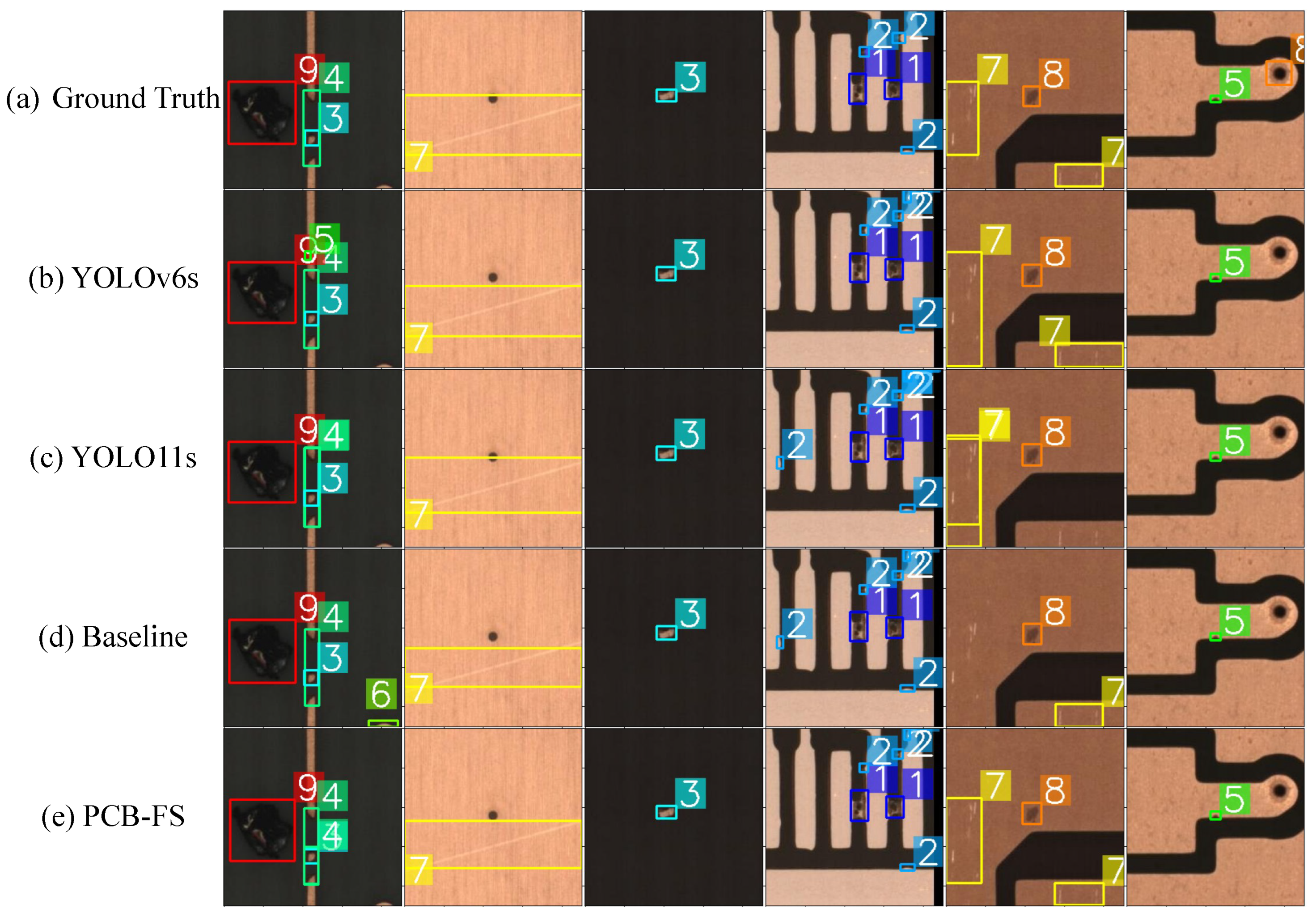 Comparison of defect detection results across different models: Ground truth, YOLOv6s, YOLO11s, Baseline, and PCB-FS.