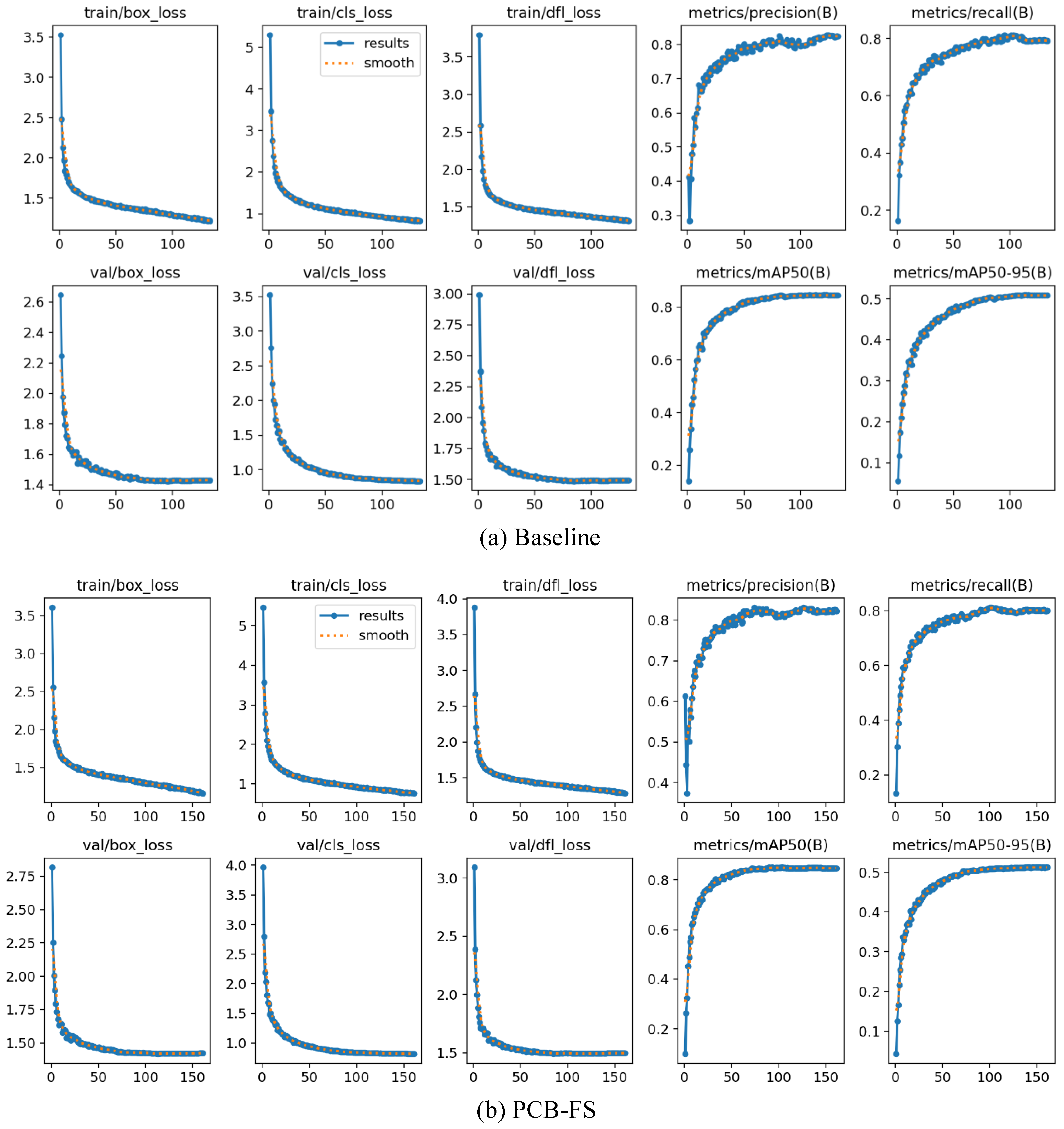 Comparison of training and validation metrics between the baseline and our PCB-FS model. The upper row shows the baseline results, and the lower row shows PCB-FS. From left to right: box loss, classification loss, distribution focal loss, precision, recall, mAP@50, and mAP@50-95. PCB-FS demonstrates faster convergence, lower final loss values, and consistently higher detection performance across all evaluation metrics.
