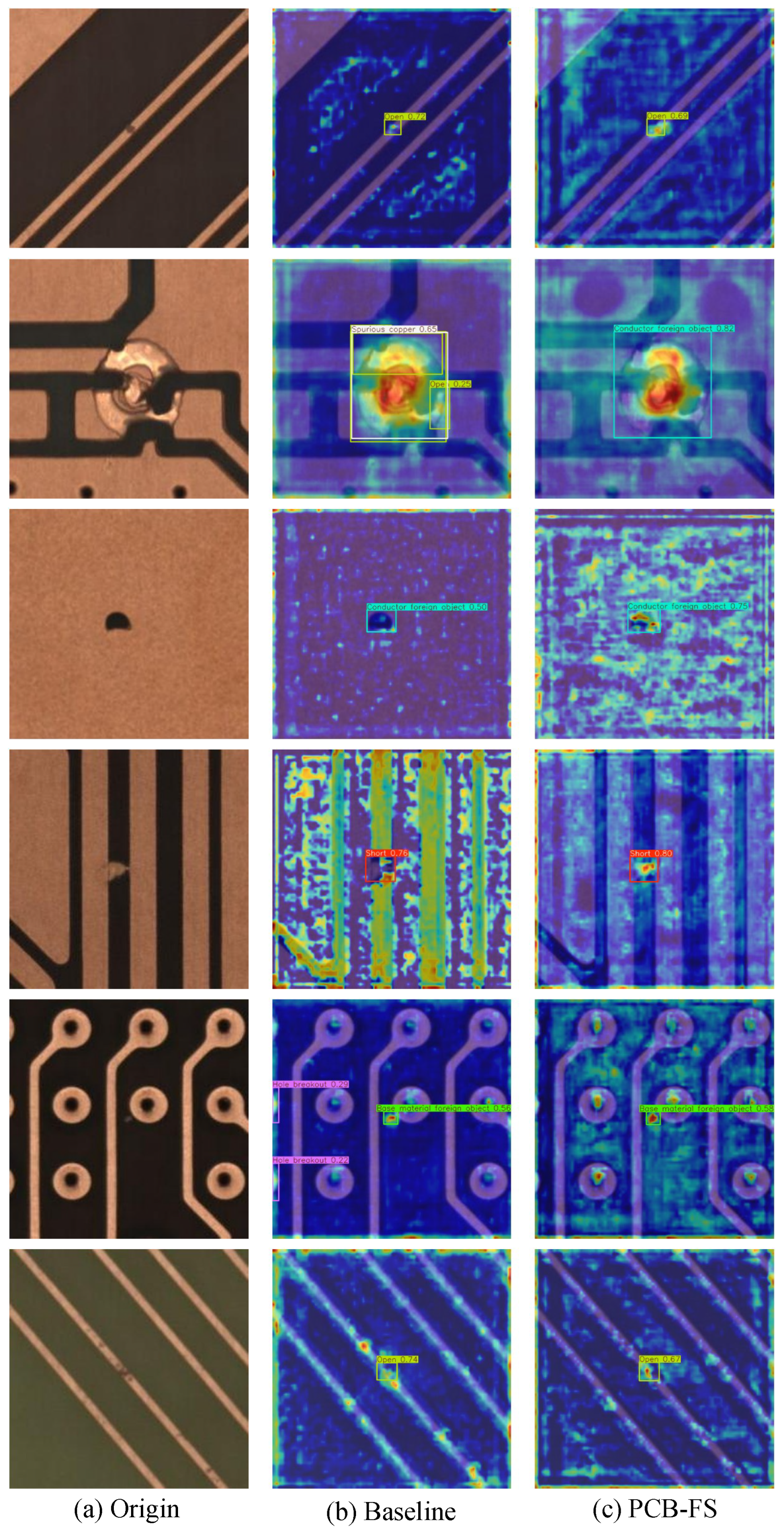 Visualization of defect localization heatmaps. (a) Original PCB image. (b) Baseline model response. (c) Proposed PCB-FS model response. The PCB-FS model produces more accurate and focused activation on true defect regions.