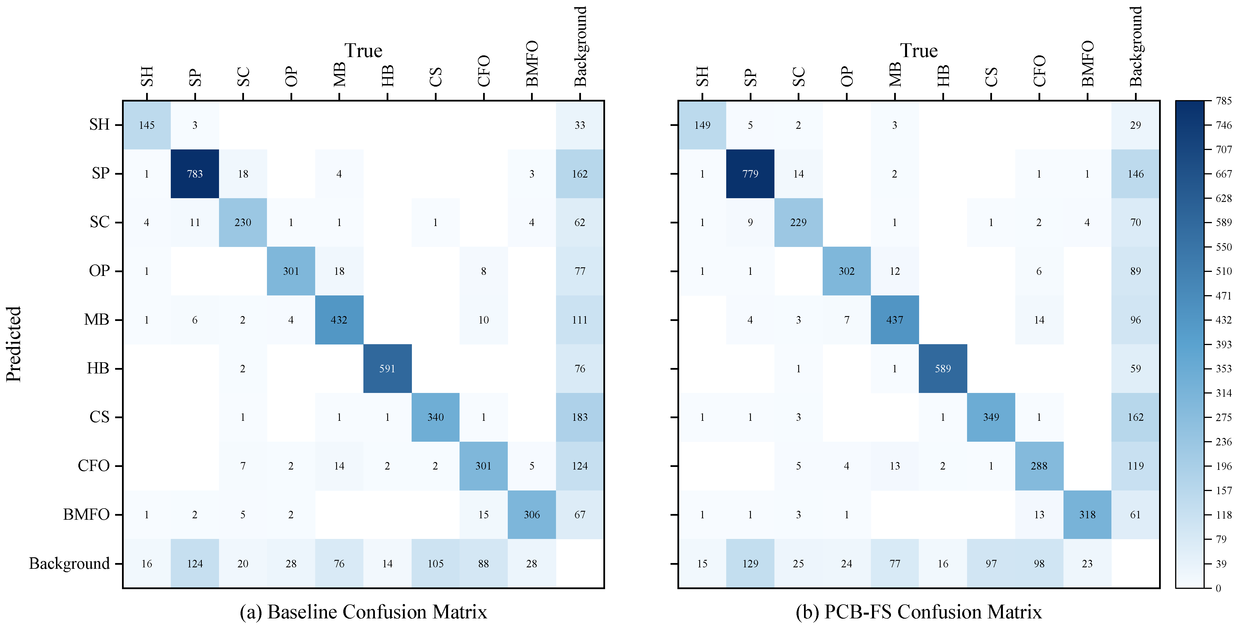 Confusion matrix comparison between the baseline model (a) and our PCB-FS model (b) on the PCB defect detection task. The PCB-FS model achieves higher correct classification rates (diagonal elements) and fewer misclassifications (off-diagonal elements) across all defect categories, demonstrating superior discriminative capability and overall accuracy.