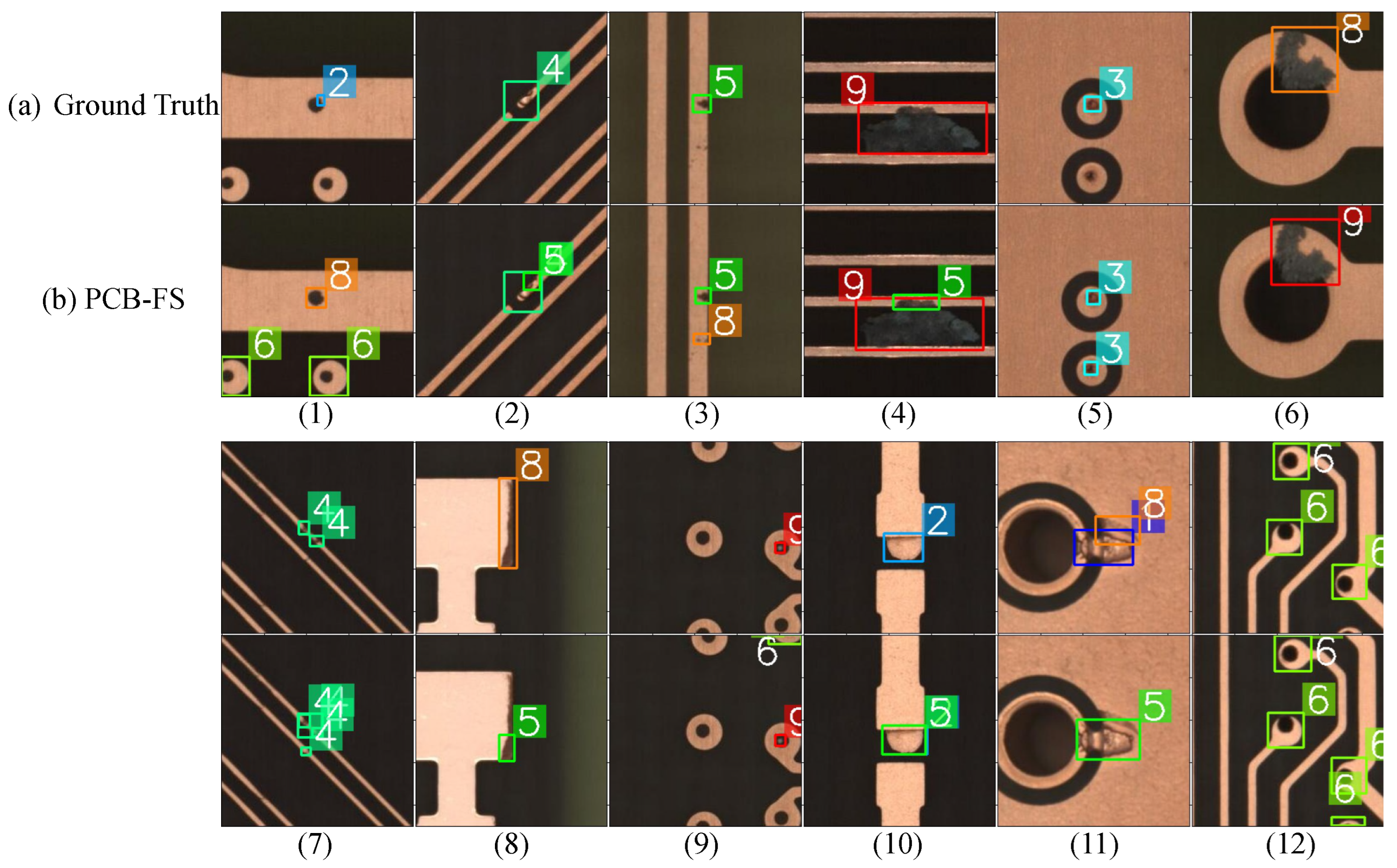 Examples of worst-case detection results: (a) Ground truth, (b) PCB-FS. Numbers 1–12 represent 12 challenging worst-case samples, encoded numerically for reference.