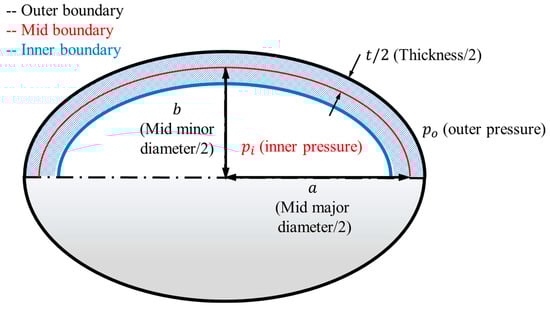 where and represent the semi-major and semi-minor axes of the mid-boundary ellipse, respectively (i.e., the semi-major and minor diameters of the mid-boundary, as illustrated in Figure 1), and denotes the uniform wall thickness of the vessel. In this study, is fixed as a known constant value. By varying the ratio , the dataset spans a wide range of shapes, including oblate ellipsoids (), prolate ellipsoids (), and the special case of spherical geometry (). The relative thickness ensures that both thin-walled and thick-walled configurations are represented in the dataset, covering the transition from shell-like to bulk material behavior.
