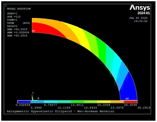 In such problems, the vessel walls experience combined radial and circumferential (hoop) stretching, often accompanied by finite axial strains depending on the boundary conditions. For spherical or cylindrical vessels, analytical solutions for radial and hoop stresses have been derived [,]. For ellipsoidal vessels with arbitrary aspect ratios , however, closed-form solutions are generally not available, and numerical methods such as the finite element method (FEM) are required to compute the stress and displacement fields.