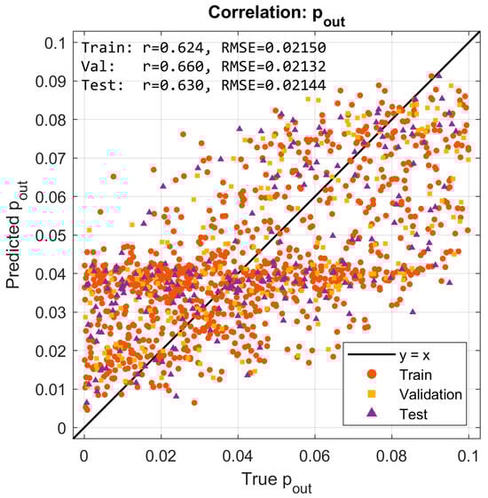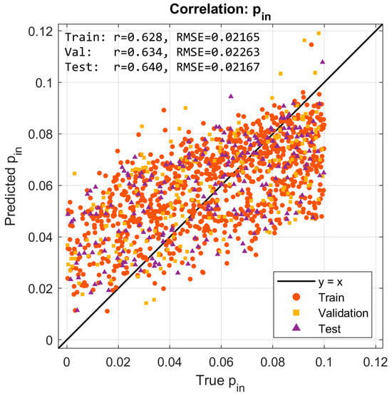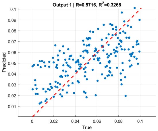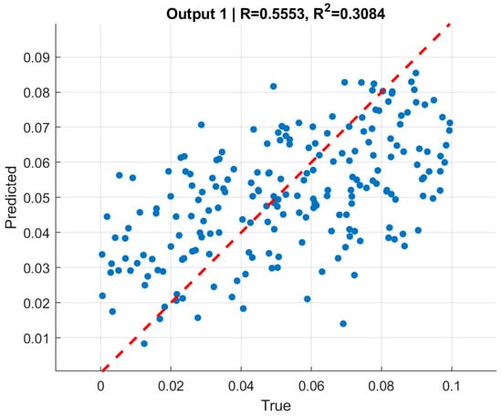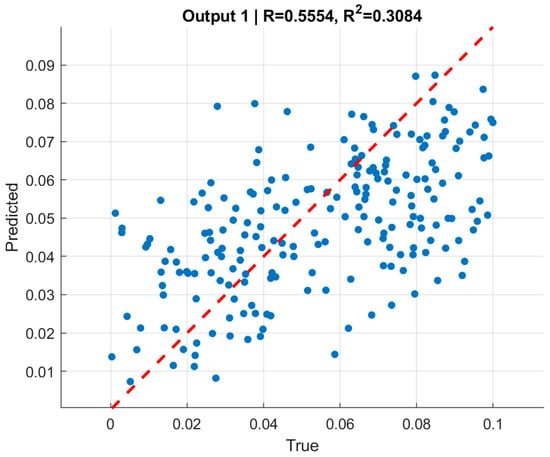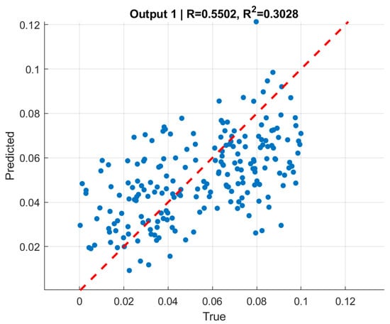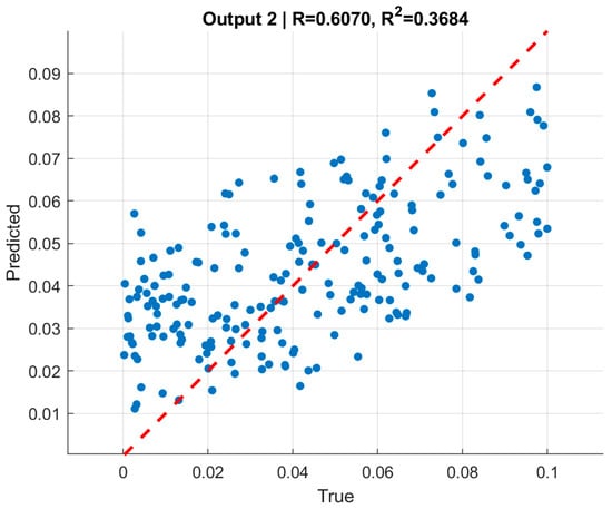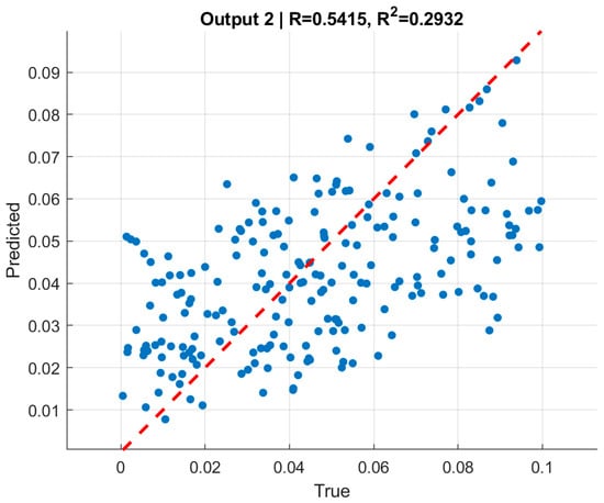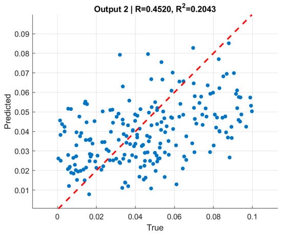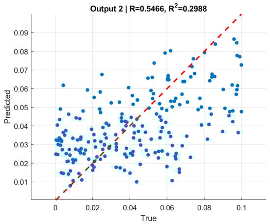 Performance metrics reflected this behavior are shown in Table 8. On the validation set, the RMSE values were 0.028–0.032 for the two outputs, with corresponding R2 values of 0.308 and 0.368. On the test set, the network achieved comparable RMSE levels (0.029–0.031), while R2 values remained modest at 0.308 and 0.293, respectively. Scatter plots of predicted versus true pressures (Figure 17, Figure 18, Figure 19 and Figure 20) confirm that the CNN was able to capture global deformation trends, but the predictions were dispersed around the regression line, reflecting limited explanatory accuracy compared to GNNs.