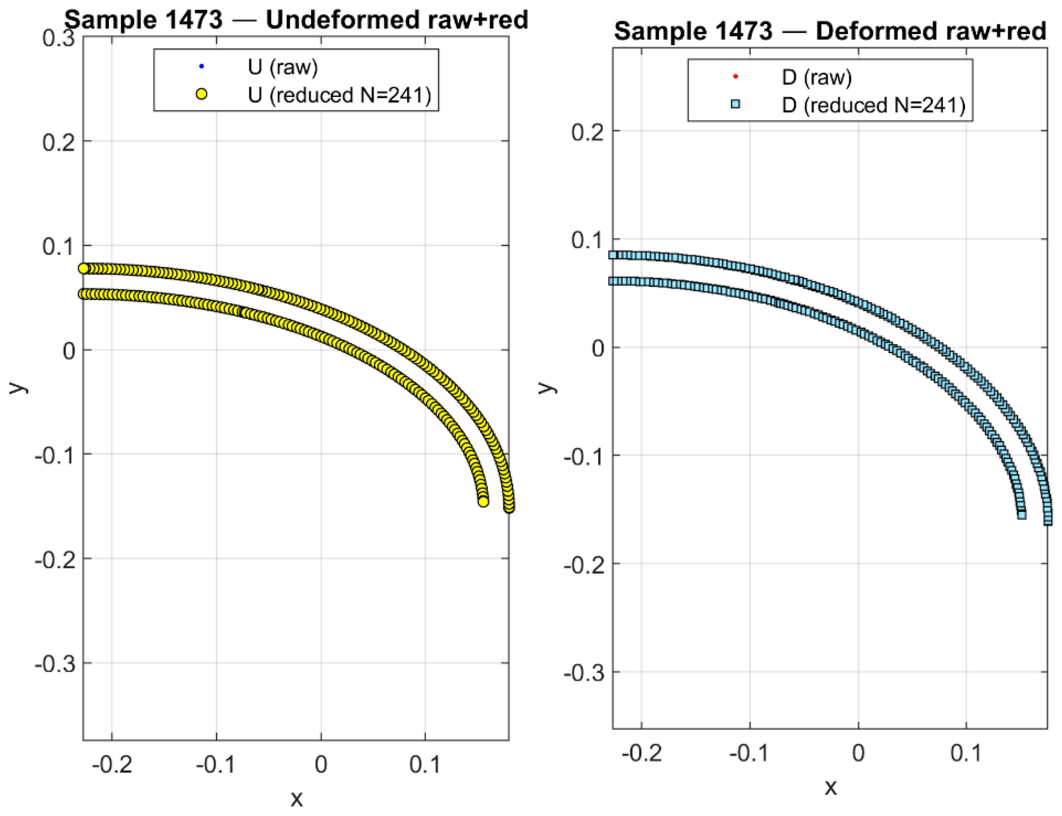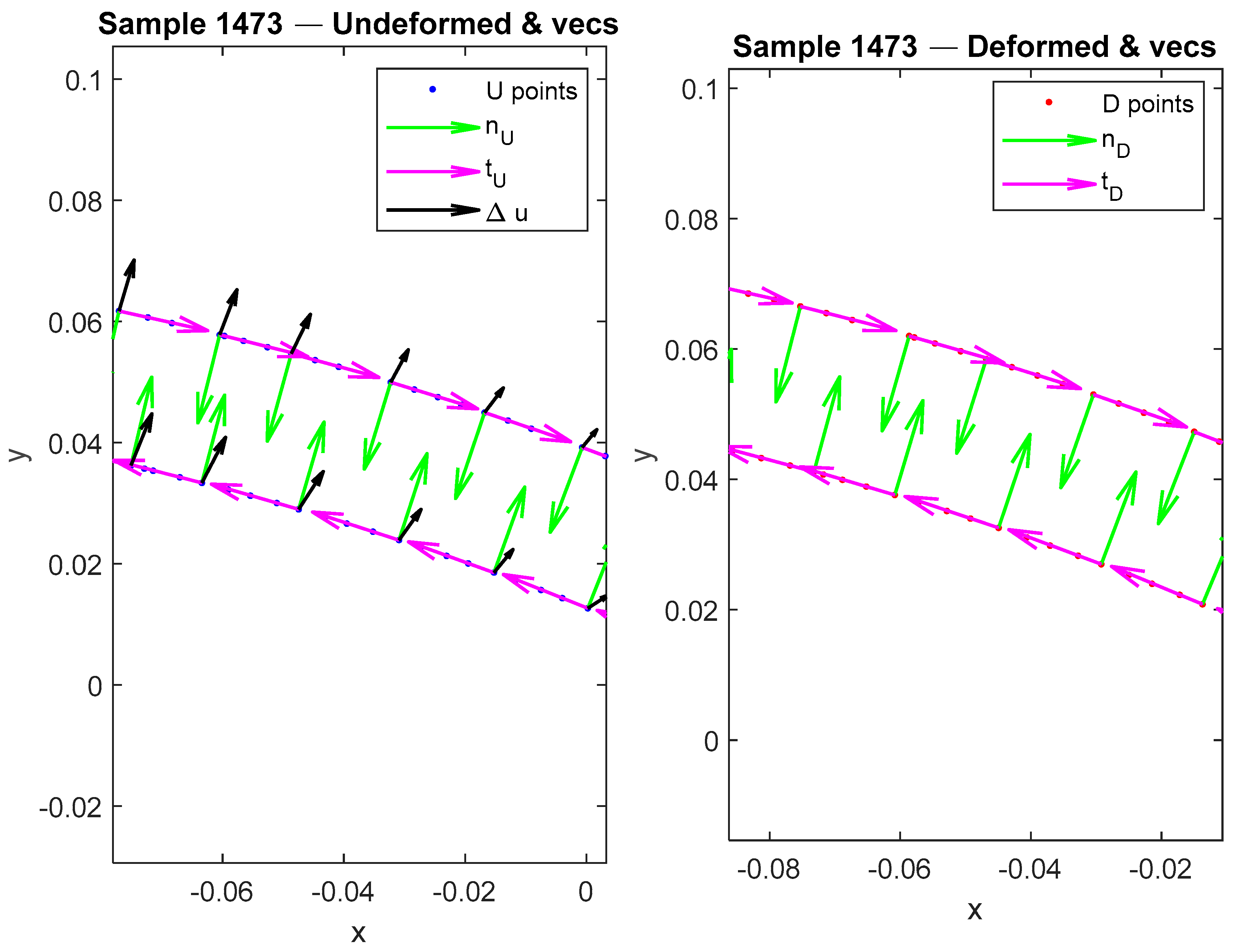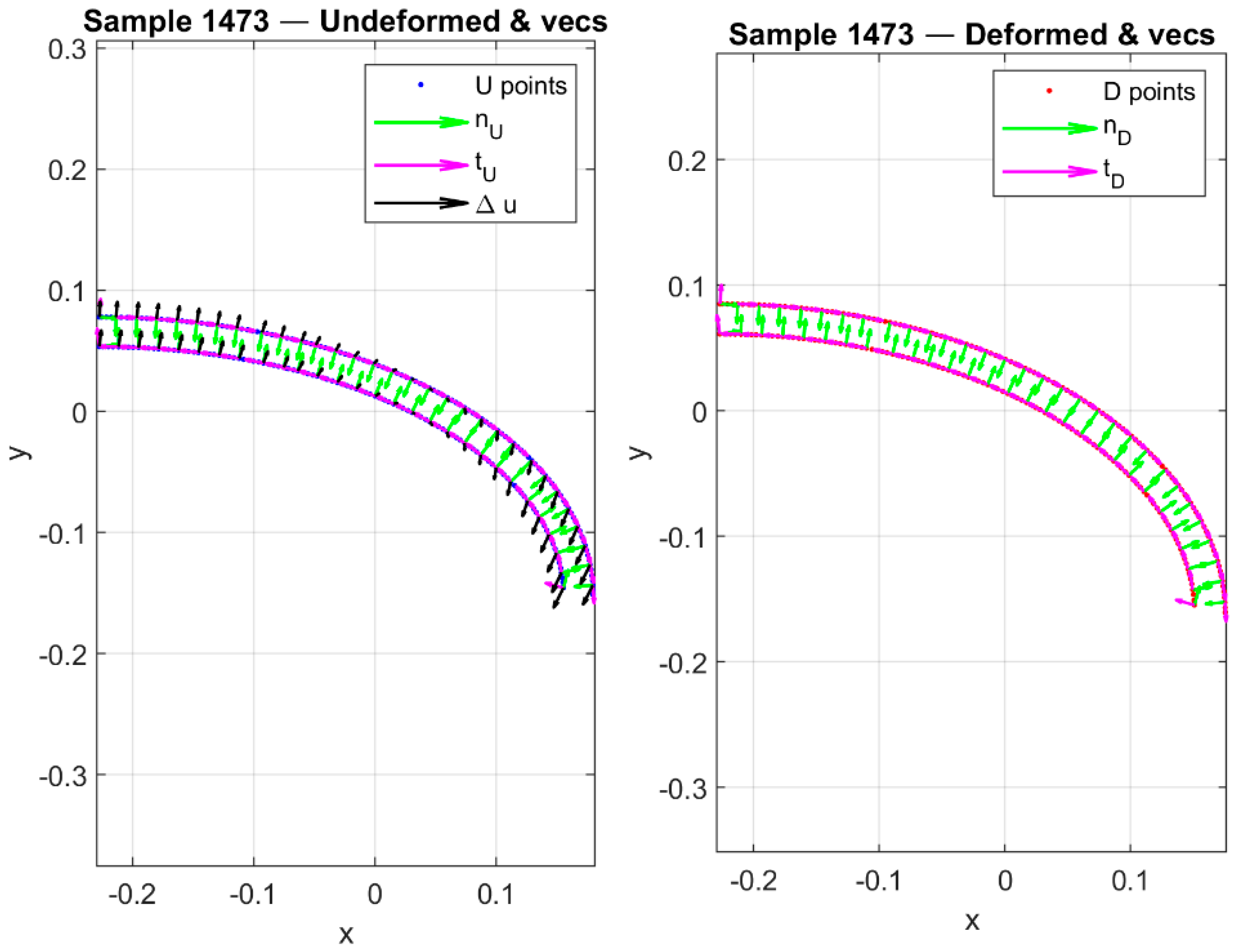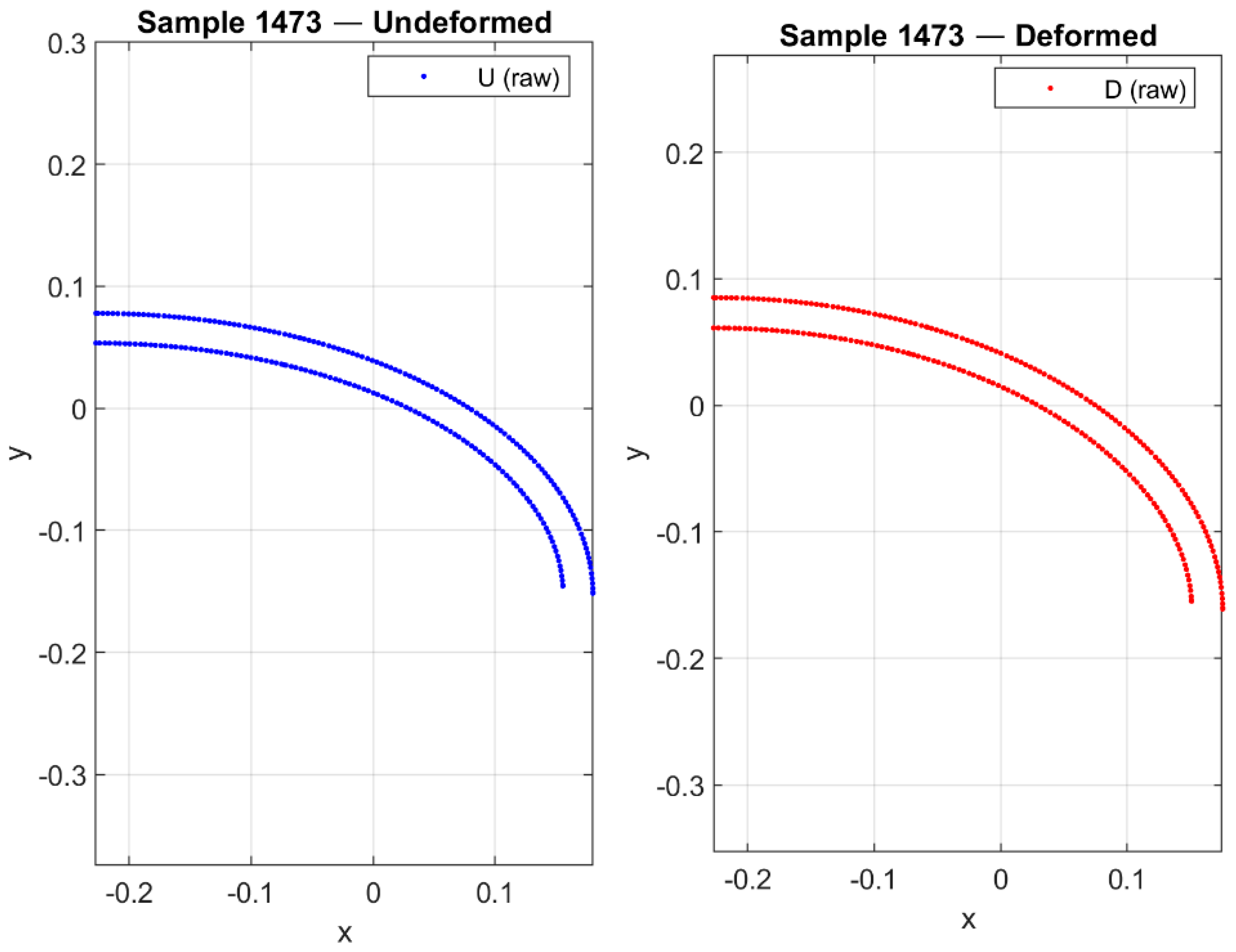 The analysis is organized into four subsections. First, we provide a quantitative evaluation of all tested architectures, reporting standard regression metrics such as root mean squared error (RMSE), coefficient of determination (R2), and correlation coefficients between predicted and ground-truth normalized pressures. Second, we complement these metrics with qualitative visualizations, highlighting representative FEM samples and the corresponding predictions of the neural networks. Third, we conduct a focused sensitivity study, contrasting two modeling stages: (i) a baseline stage where only the undeformed and deformed boundary profiles are provided as inputs, and (ii) an enriched stage where all additional geometric features—namely displacement differences (Δu), normals, and tangents—are incorporated into the node attributes. This comparison clarifies the contribution of mechanics-informed features beyond raw geometry. Finally, we present the architectural evolution and optimization effects, documenting the from enriched GNN to CNN models architectures, and demonstrating how Bayesian hyperparameter optimization improved convergence and predictive stability.