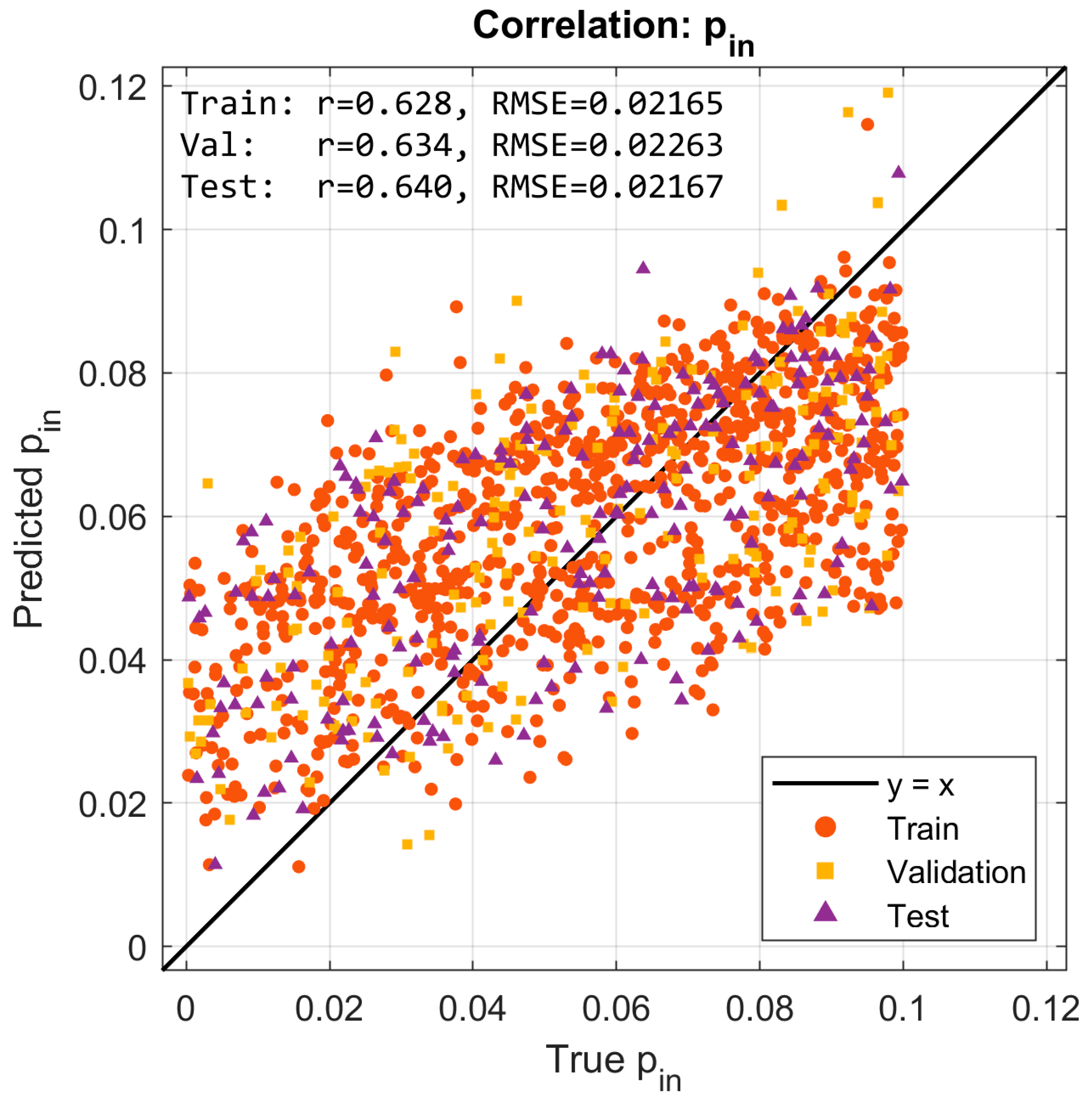 The moderate correlation coefficients () should be interpreted in the context of the narrow-normalized pressure range (0–0.1) used in the dataset, which naturally limits statistical variance and reduces the sensitivity of correlation-based metrics. Despite this, the predictions exhibit very low absolute errors and excellent consistency across training, validation, and test sets. Therefore, the slightly reduced -values do not indicate model weakness but rather reflect the compact target domain and the stability of the learned inverse mapping.