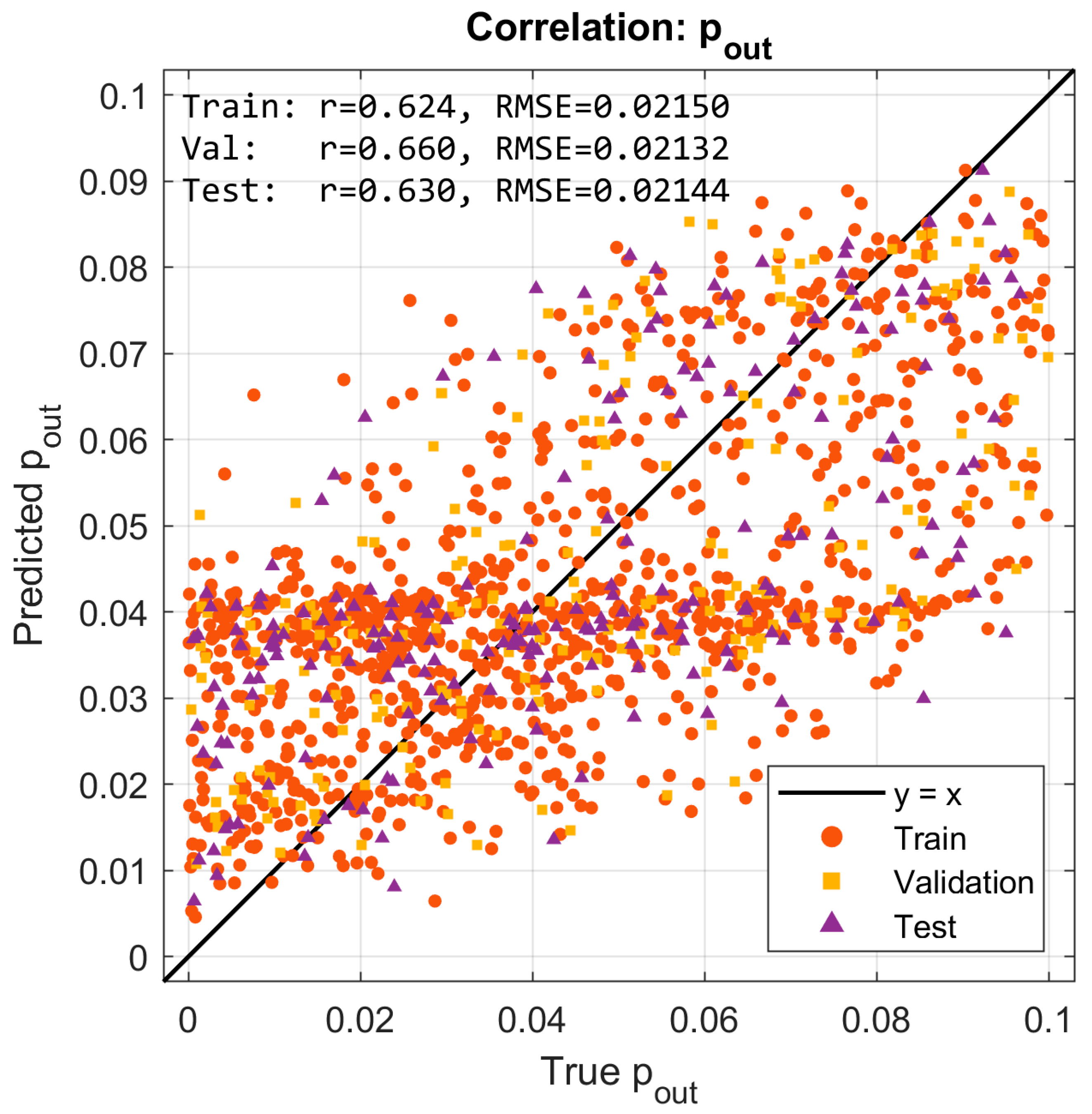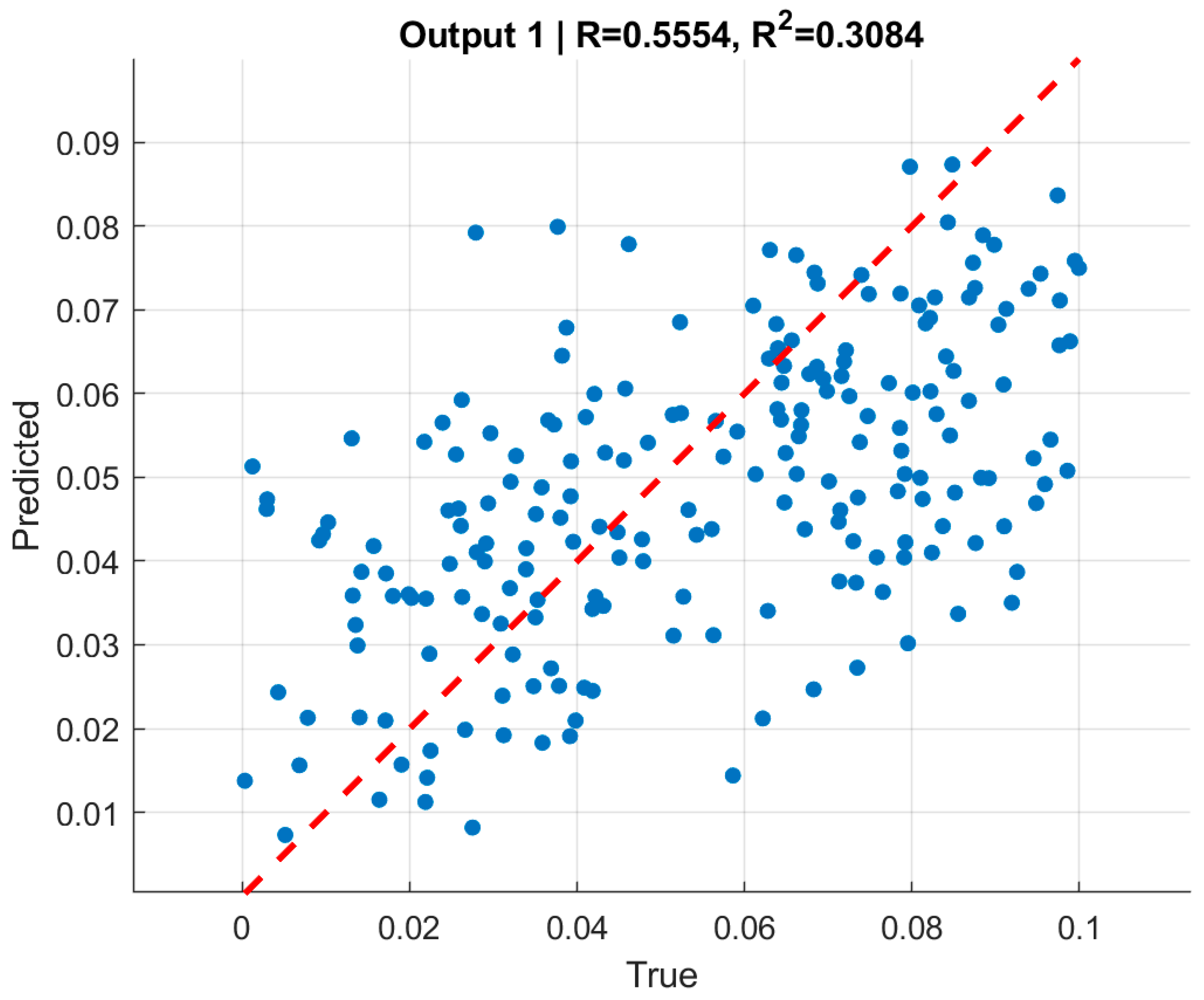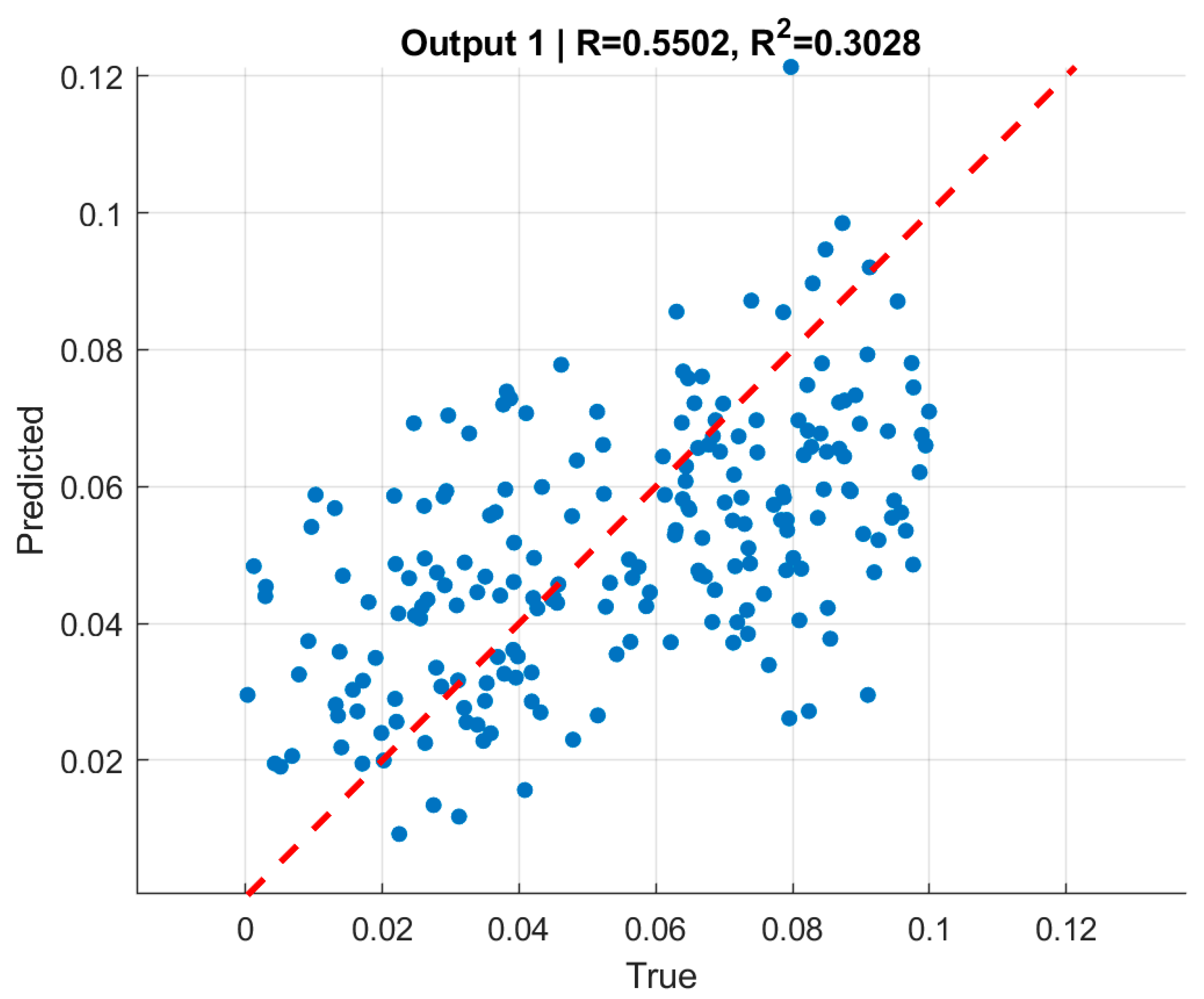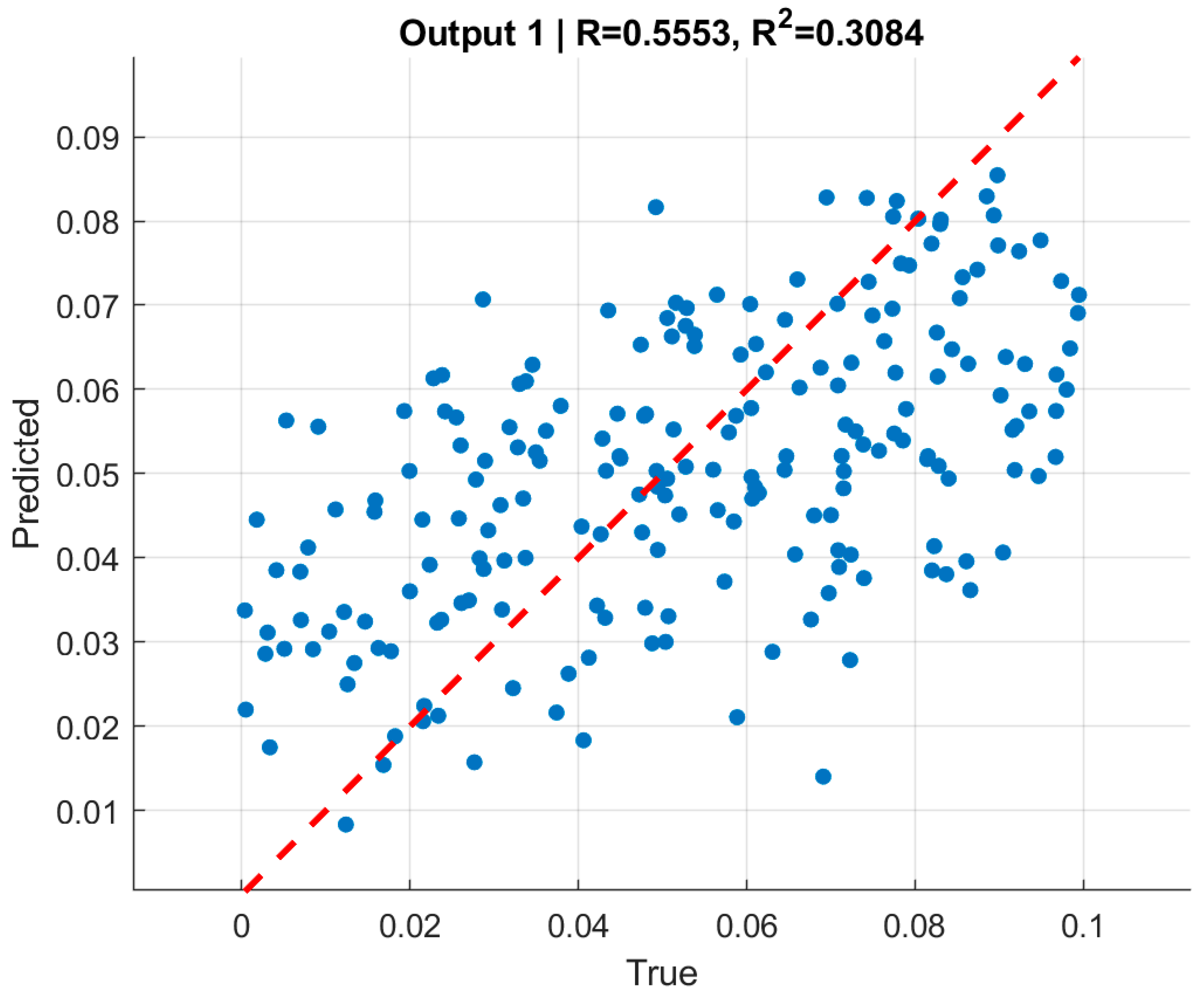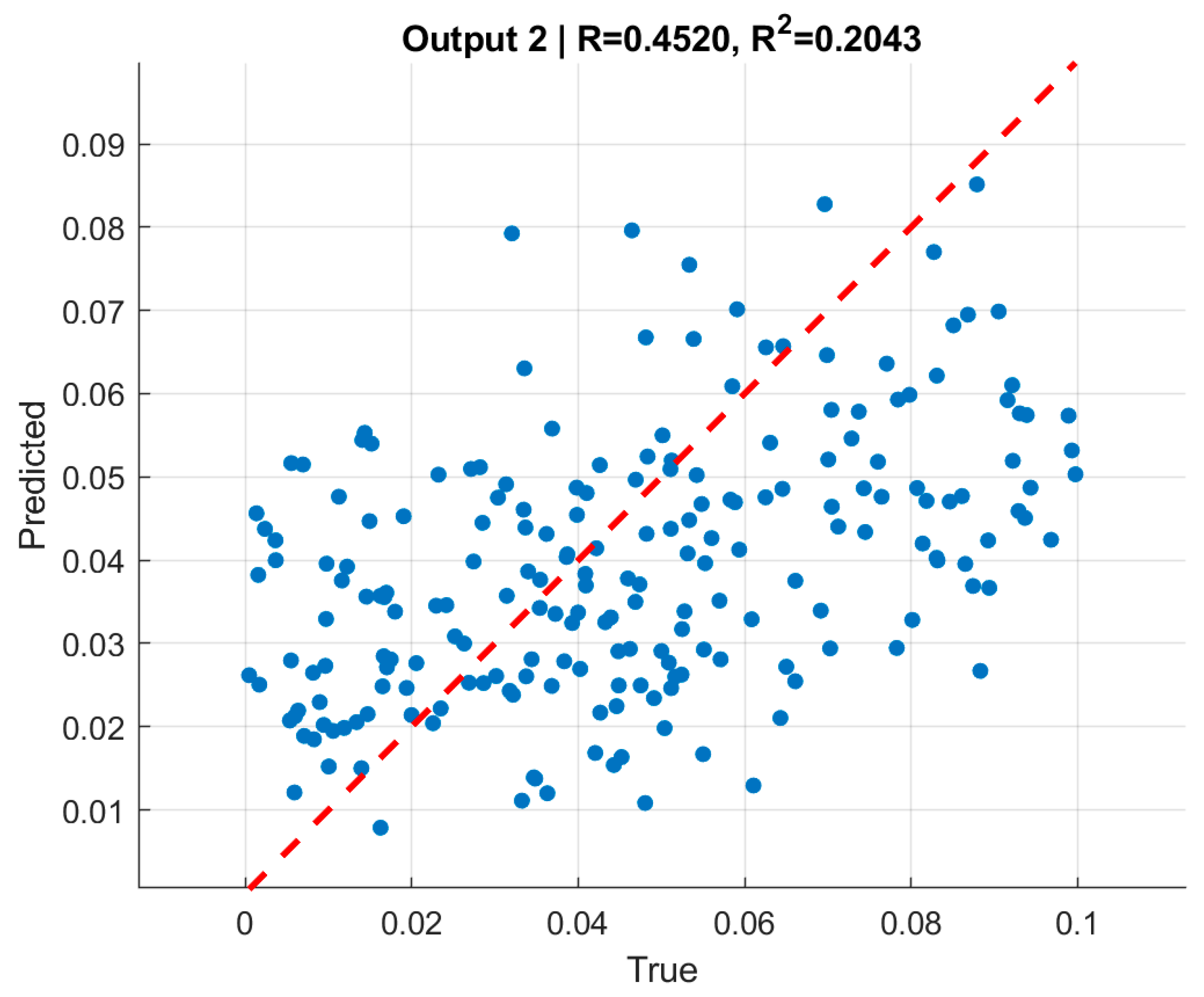 . The moderate correlation values, despite very low RMSE, are consistent with the limited dynamic range of the targets [0, 0.1], where even small absolute deviations significantly affect variance-based statistics. This highlights the importance of reporting both absolute error metrics (RMSE) and relative/normalized measures when interpreting model quality.