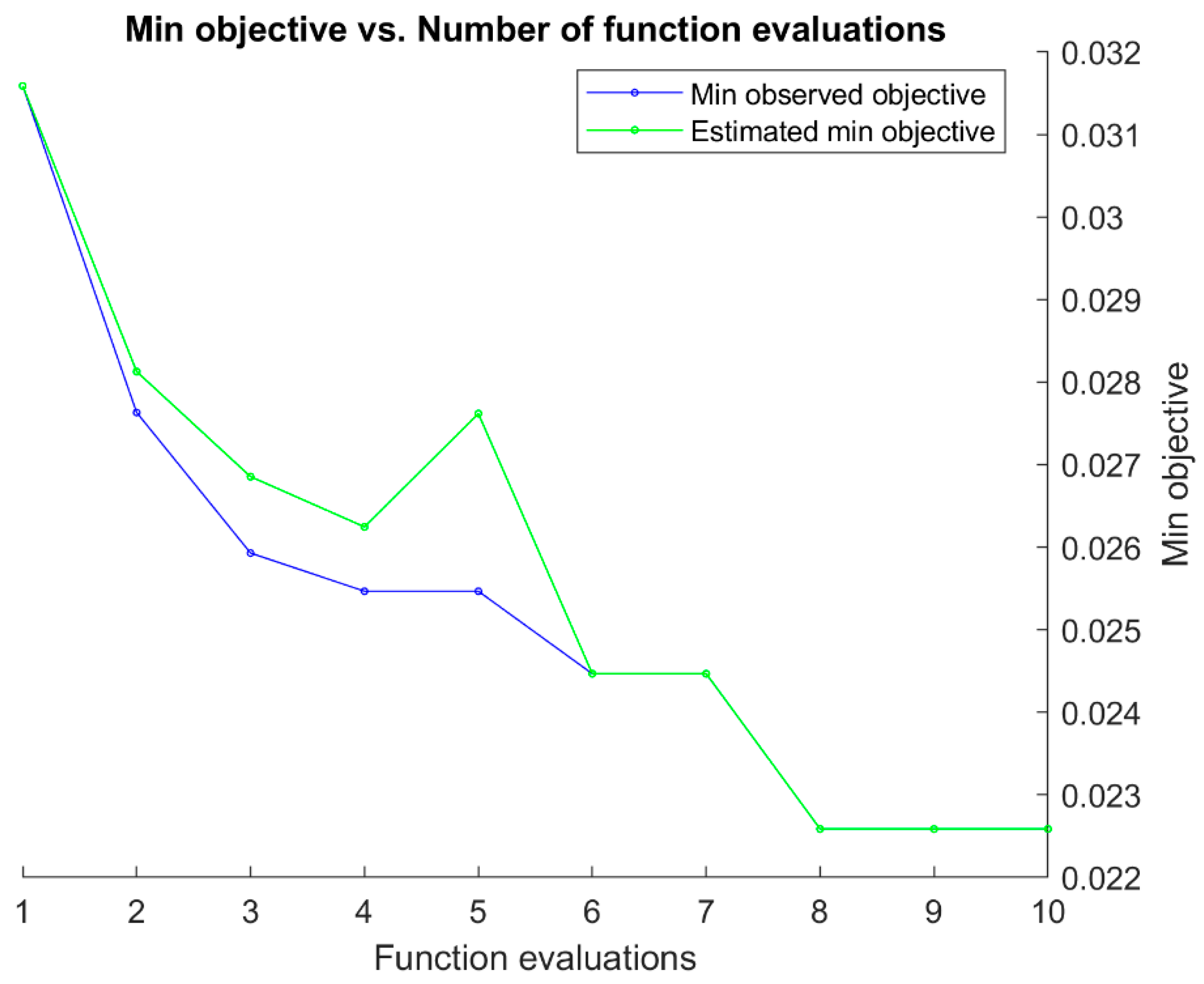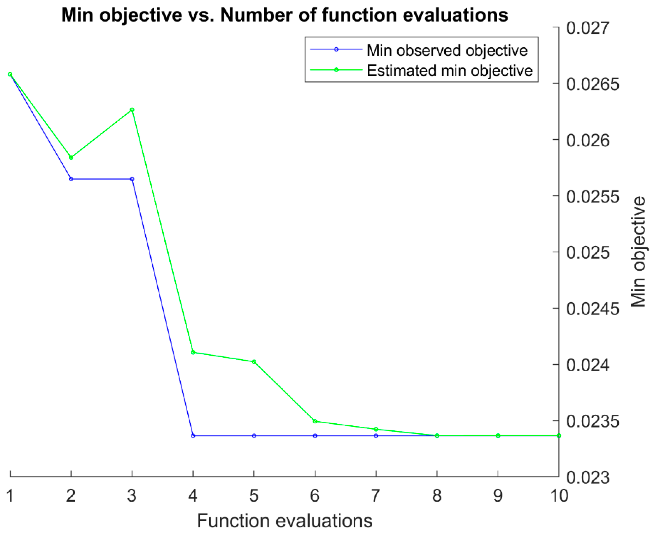 The close agreement between the observed and estimated objective curves further indicates that the surrogate model employed in BO provided accurate guidance during the search. For the model, the minimum objective converged near 0.023, while for the model it reached approximately 0.022—values consistent with the RMSE reported on the independent validation and test splits. These trajectories demonstrate that BO effectively navigated the hyperparameter space for both networks, yielding architectures that balanced accuracy with stability.