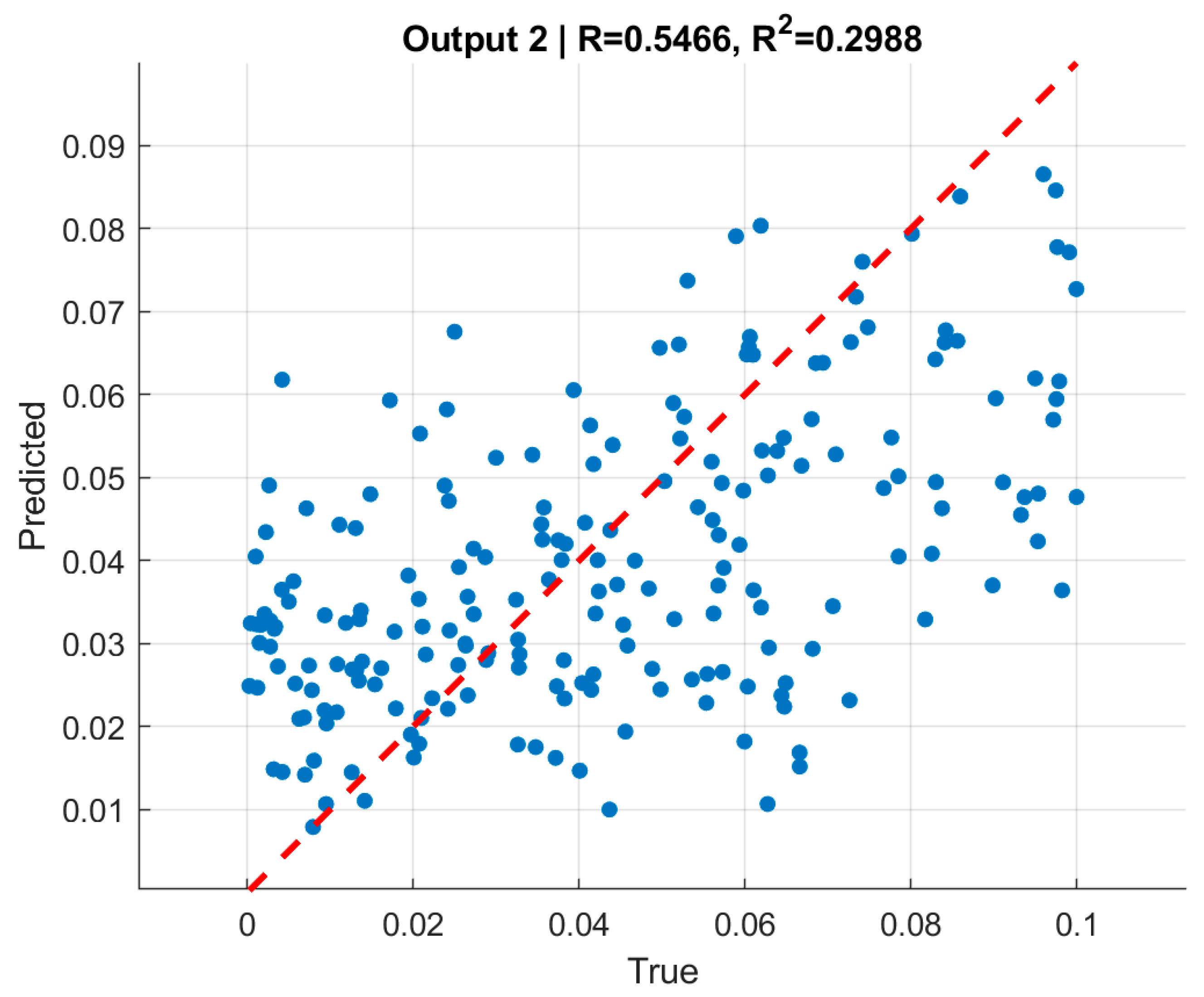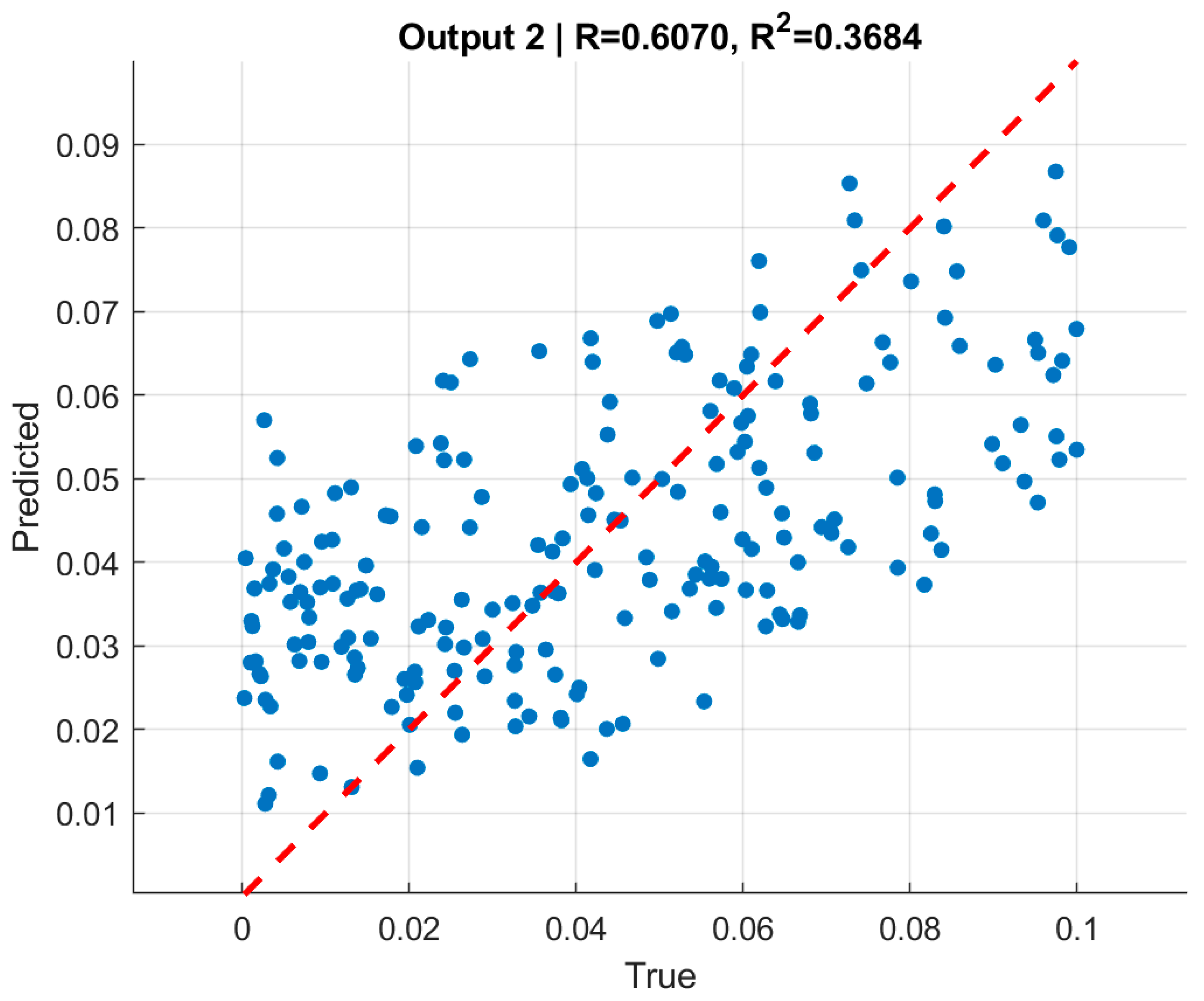 Table 8. On the validation set, the RMSE values were 0.028–0.032 for the two outputs, with corresponding R