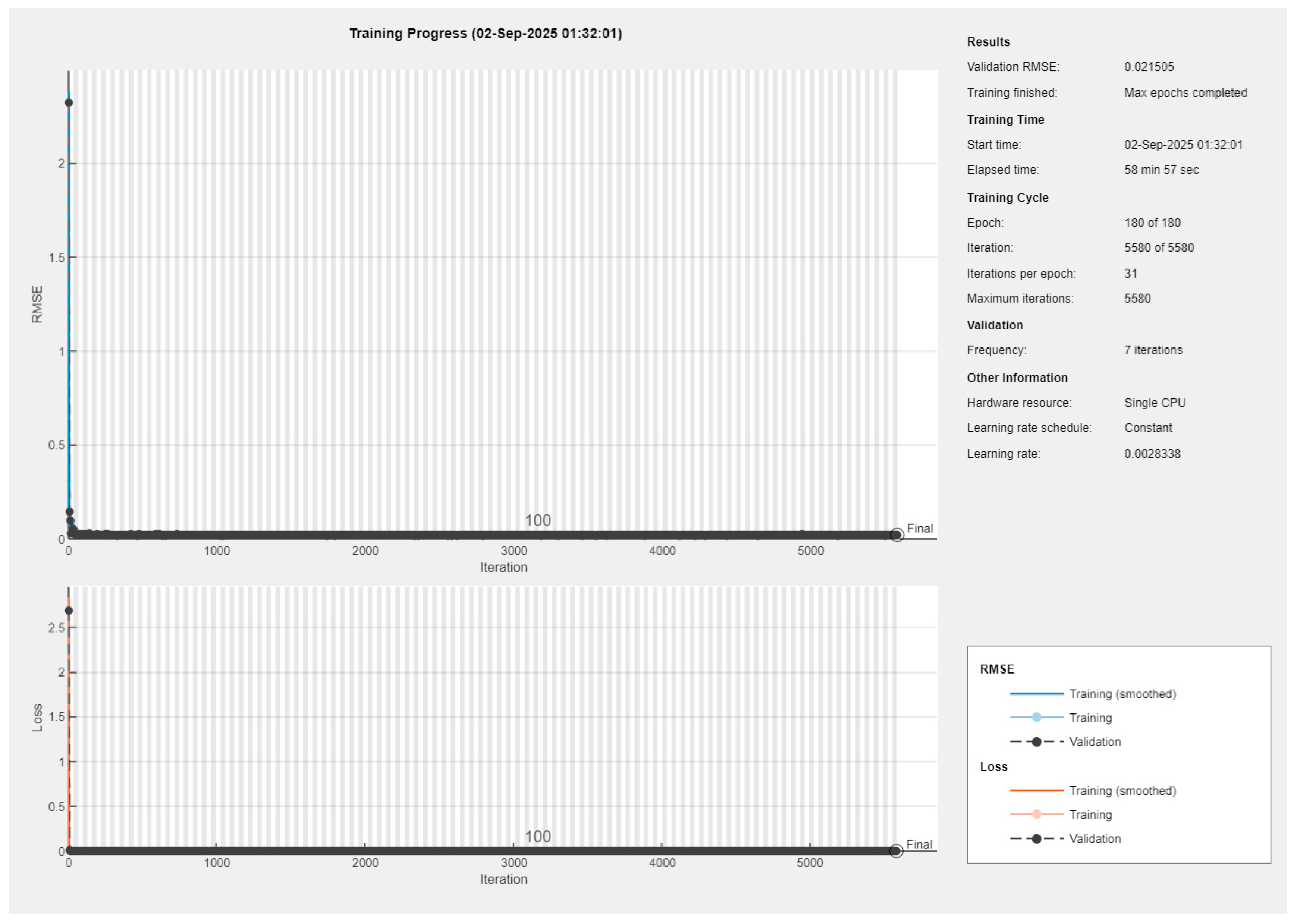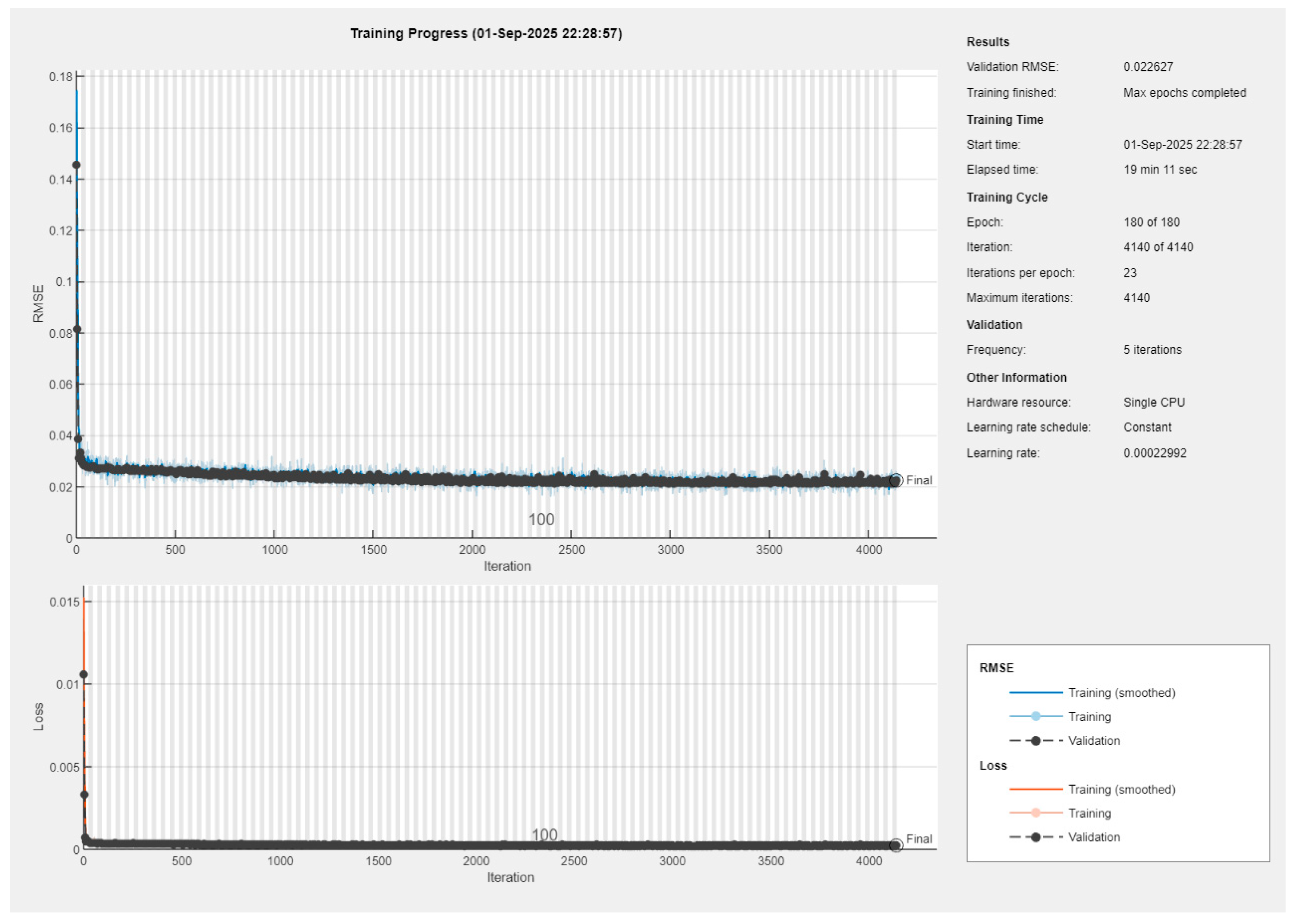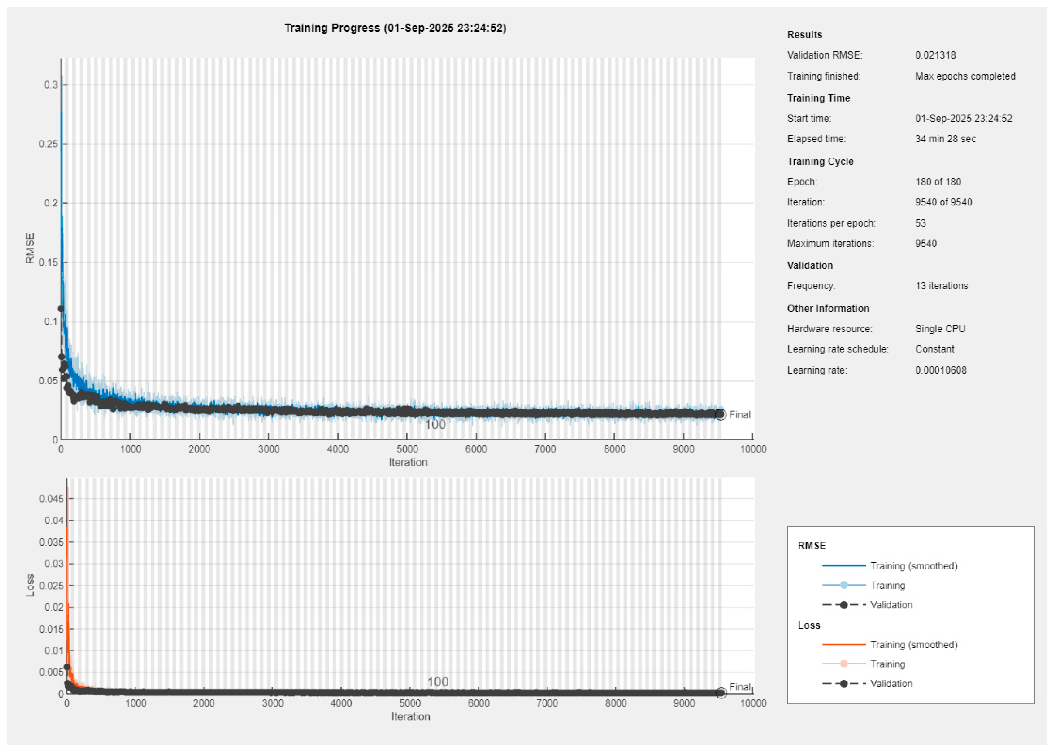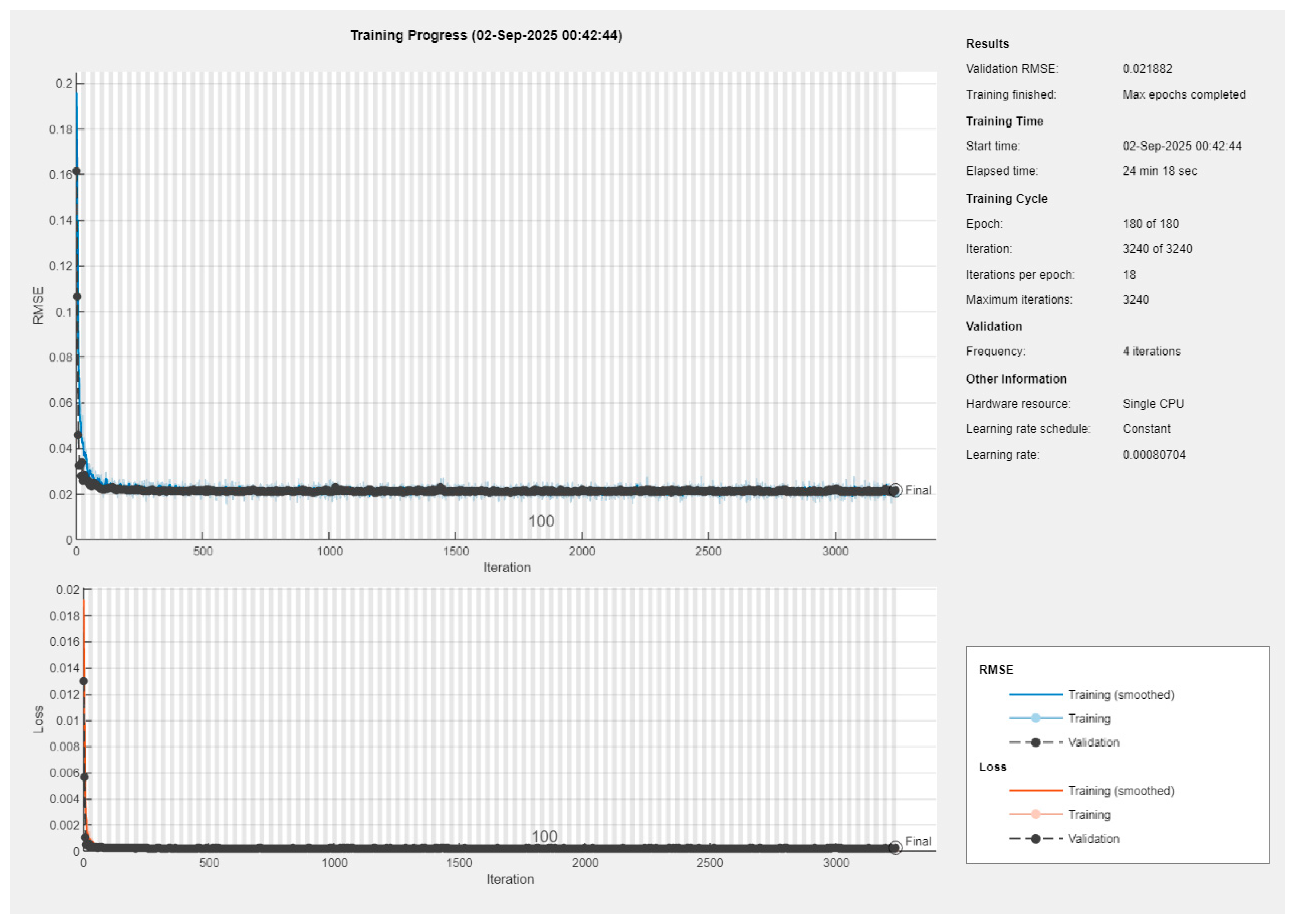 Appendix A) indicated rapid error decay within the first few hundred iterations, followed by a long plateau where both training and validation losses remained nearly parallel. The validation RMSE stabilized around 0.021–0.022 for both internal and external pressures, with negligible divergence from training curves. These learning dynamics confirm that the chosen configurations effectively prevented overfitting while ensuring consistent convergence.