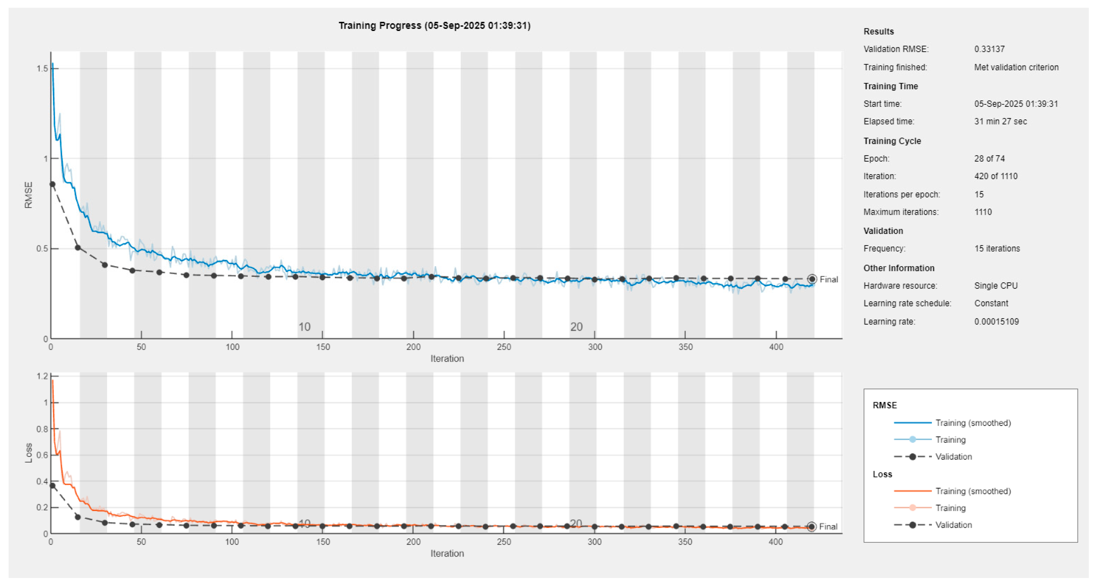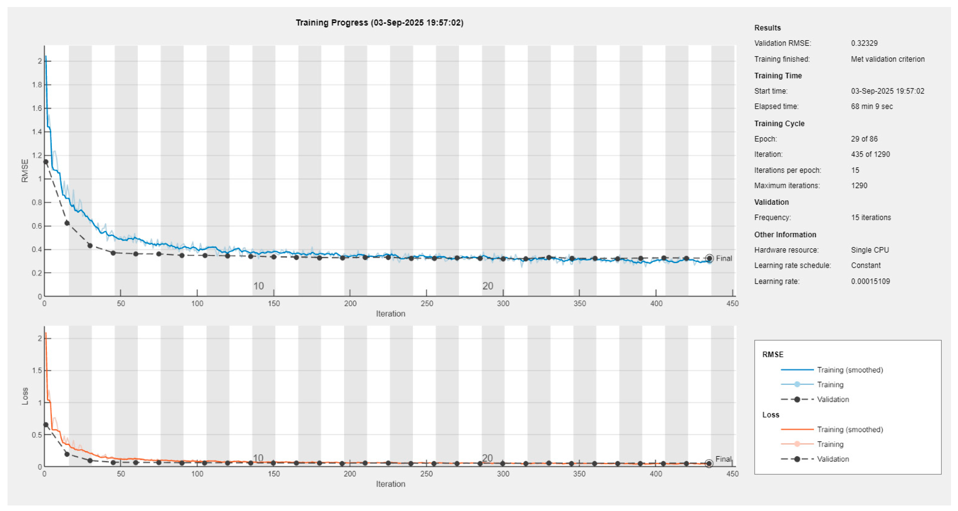 The learning dynamics demonstrated consistent reduction in both training and validation RMSE during the first 20–30 epochs, after which both curves plateaued. The final validation RMSE stabilized around 0.032, which is noticeably higher than the full-ring CNN but still an improvement compared to the quarter-section case. Importantly, validation and training curves remained close throughout training, indicating that overfitting was controlled effectively.