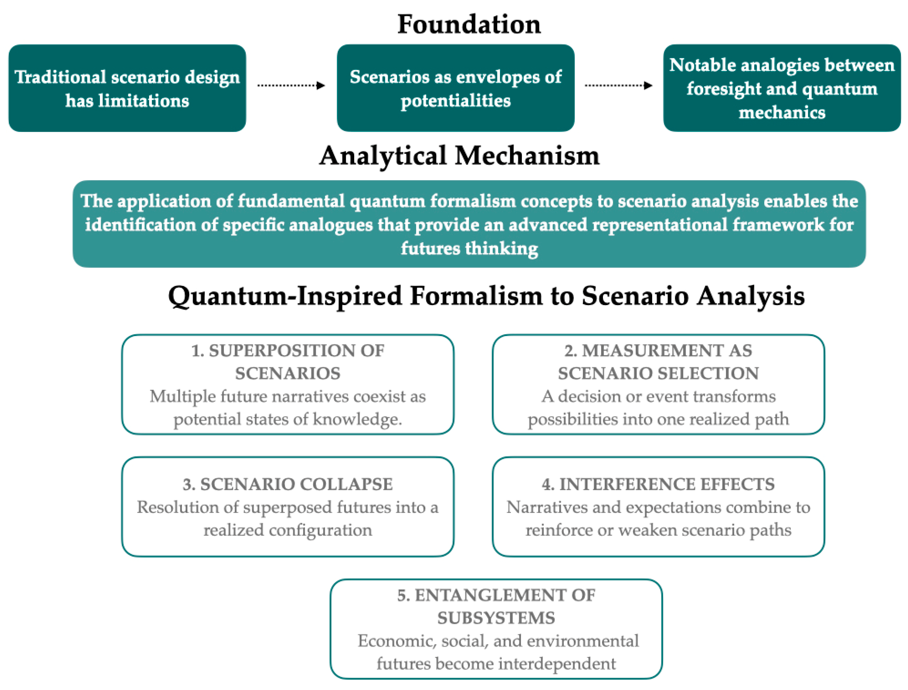 To this end, the application of fundamental quantum-formalism concepts to scenario analysis enables the identification of specific analogues that provide an advanced representational framework for futures thinking. This framework accommodates ambiguity, conflicting beliefs, and systemic interdependence without the need for artificial separation or additivity [