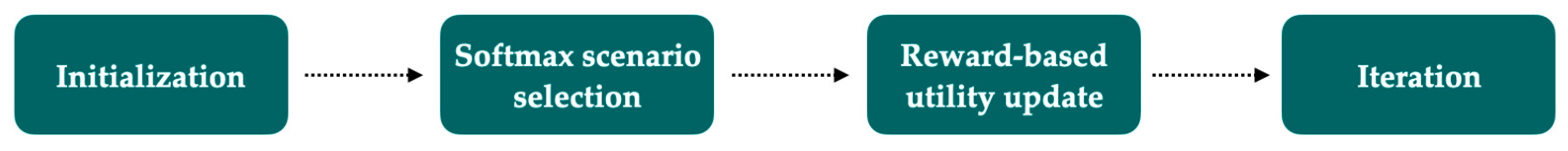 This model constitutes an initial endeavor to integrate reinforcement learning with scenario selection under conditions of uncertainty. Although it provides promising insights, it is based on simplified assumptions, such as agent homogeneity and fixed reward structures.