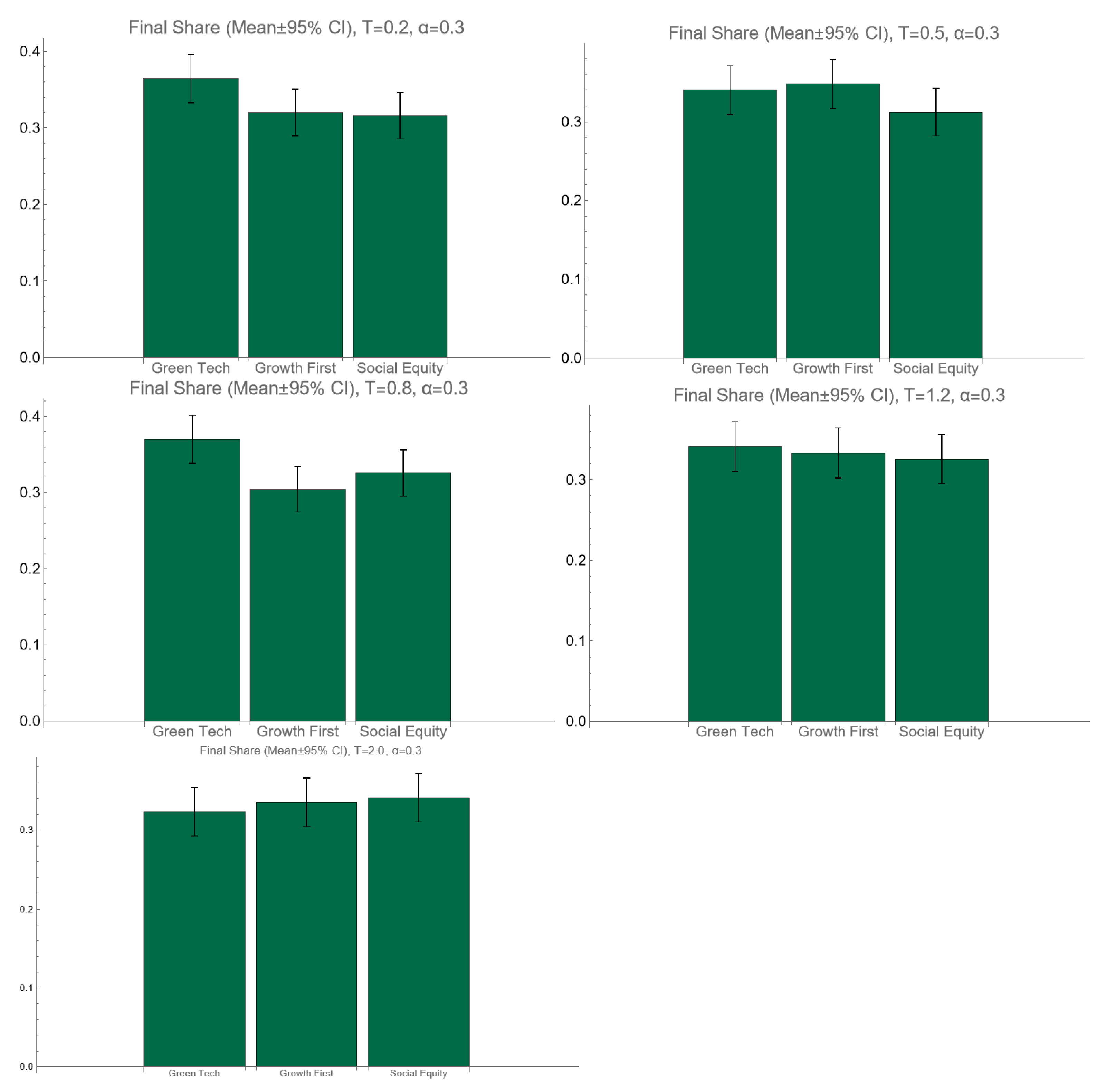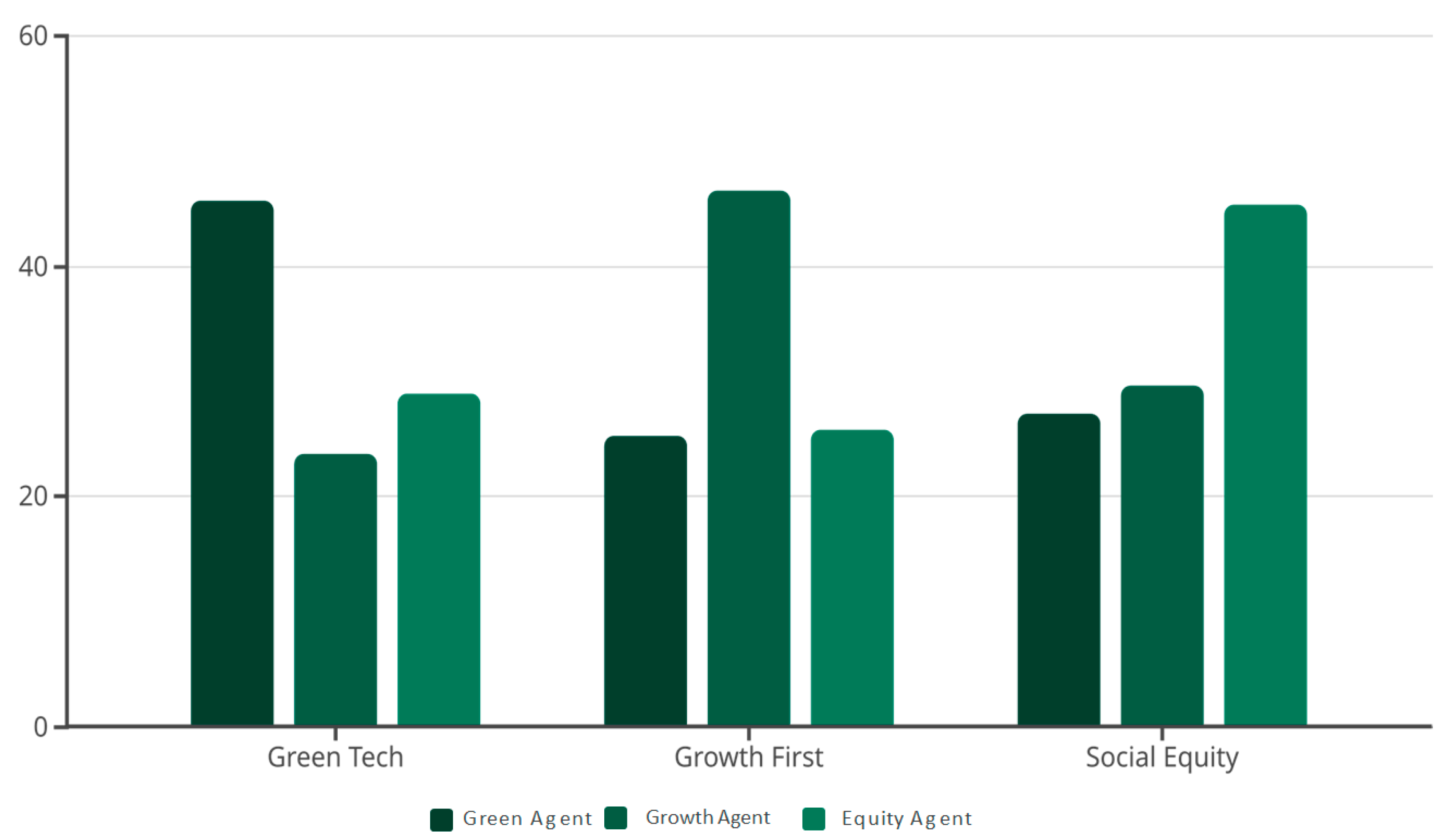 Specifically, the Green agent selected the Green Tech scenario in 45.7% of cases (std. dev. 0.045), while choices for Growth First and Social Equity lagged behind at 25.3% and 27.2%, respectively. Conversely, the Growth agent favored the Growth First scenario in 46.6% of rounds (std. dev. 0.046), with lower preference levels for Green Tech (23.7%) and Social Equity (29.7%). Finally, the Equity agent selected the Social Equity scenario most frequently (45.3%, std. dev. 0.048), with roughly equal but lower probabilities for the other two scenarios.