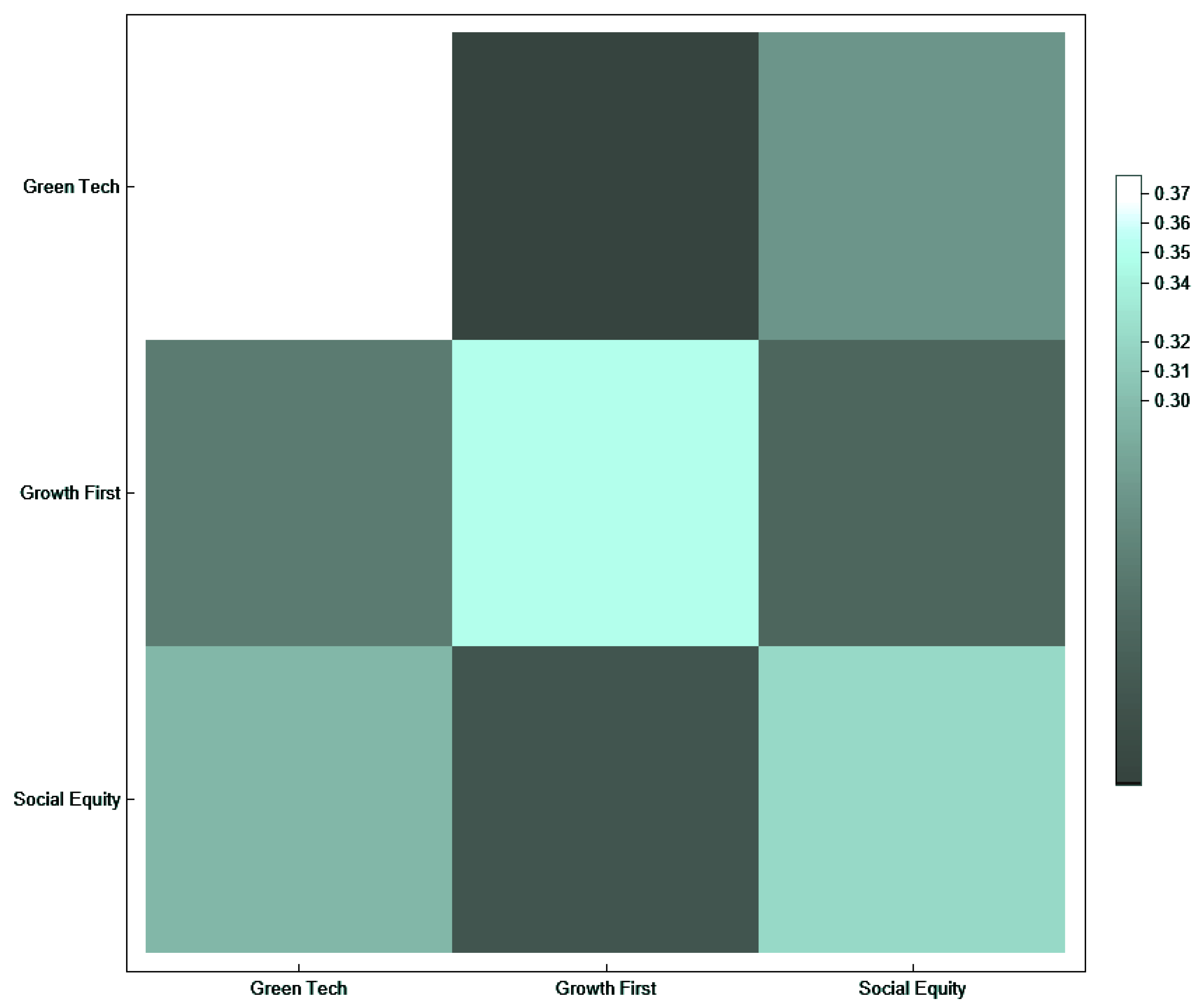 Figure 4) shows several critical dynamics. Notably, diagonal entries are not predominant, indicating a moderate degree of scenario switching. This observation reflects the exploratory nature of the learning rule and the absence of a firm commitment to a singular scenario. However, the values are not uniform either, suggesting structured tendencies: for example, Green Tech exhibits relatively high outflows to Growth First (38.2%), and Social Equity is the most frequently returned-to scenario from others, especially by the Growth agent.