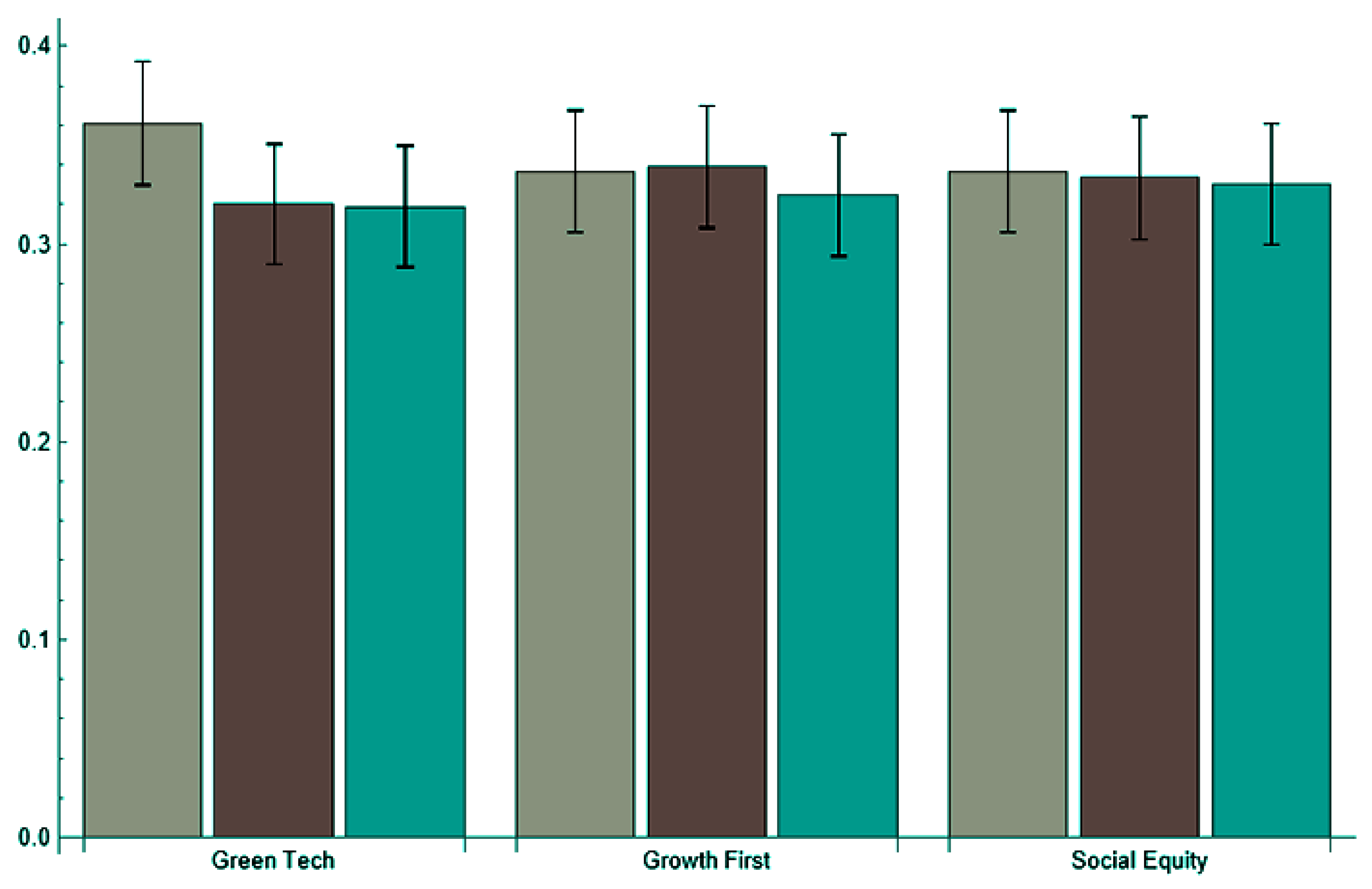 Figure 3). For example, the Green agent shows the highest average preference for the “Green Tech” scenario (mean 0.457, sd 0.045), whereas the Growth agent prefers “Growth First” (mean 0.466, sd 0.046), and the Equity agent tends toward “Social Equity” (mean 0.453, sd 0.048). This alignment is reflected in the final choice distributions, where the plurality of each agent type selects its anticipated scenario, although not to the exclusion of other options.